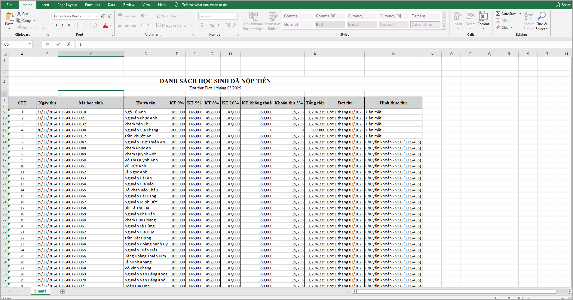 Hàng tháng, kế toán lập Danh sách học sinh đã nộp tiền để kiểm tra tình hình nộp tiền các khoản thu. Từ đó, kế toán sẽ lên kế hoạch chi trả và làm việc với các nhà cung cấp