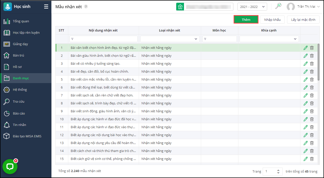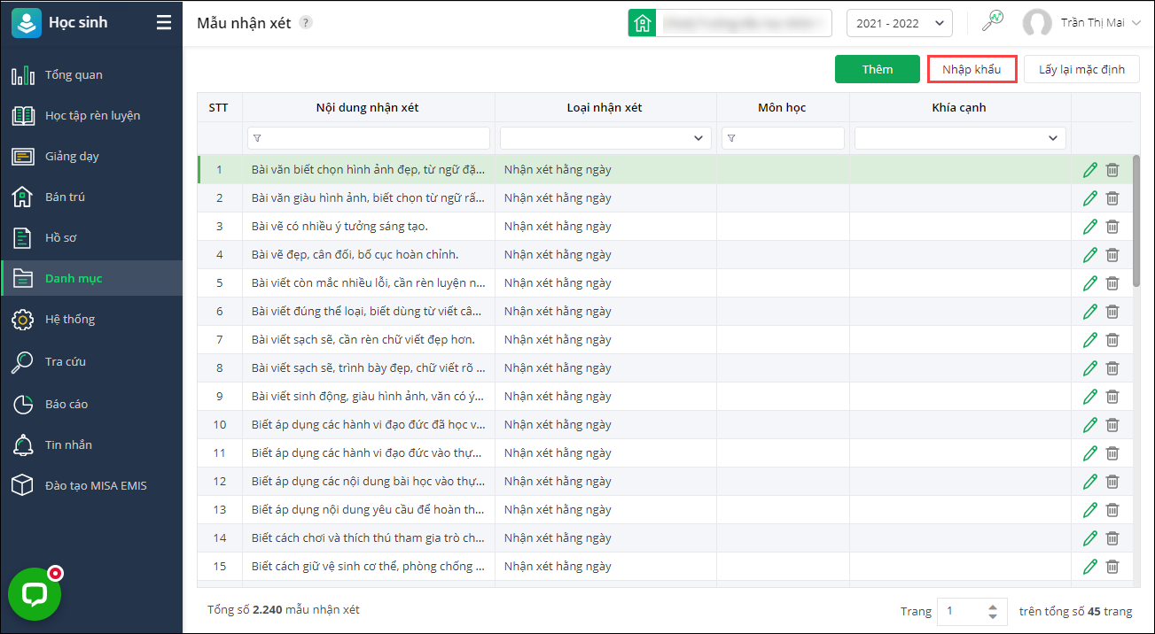 - Anh/chị có thể thêm từng mẫu nhận xét hoặc nhập khẩu mẫu nhận xét như sau: