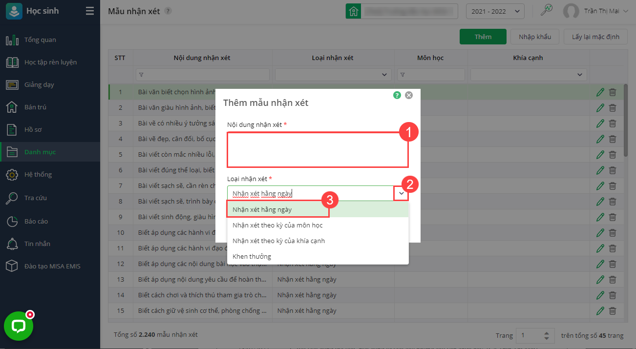 - Khai báo thông tin nhận xét như: Nội dung nhận xét, Loại nhận xét.