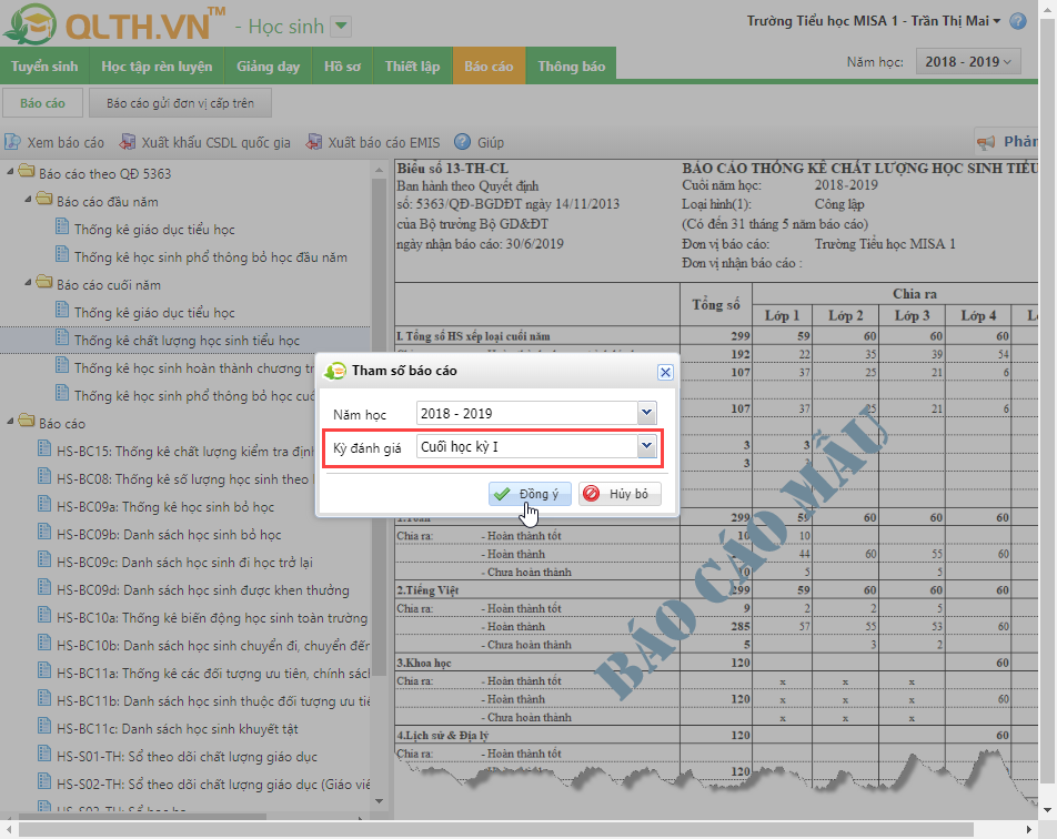- Vào menu Báo cáo\Báo cáo theo QĐ 5363\Thống kê chất lượng học sinh tiểu học