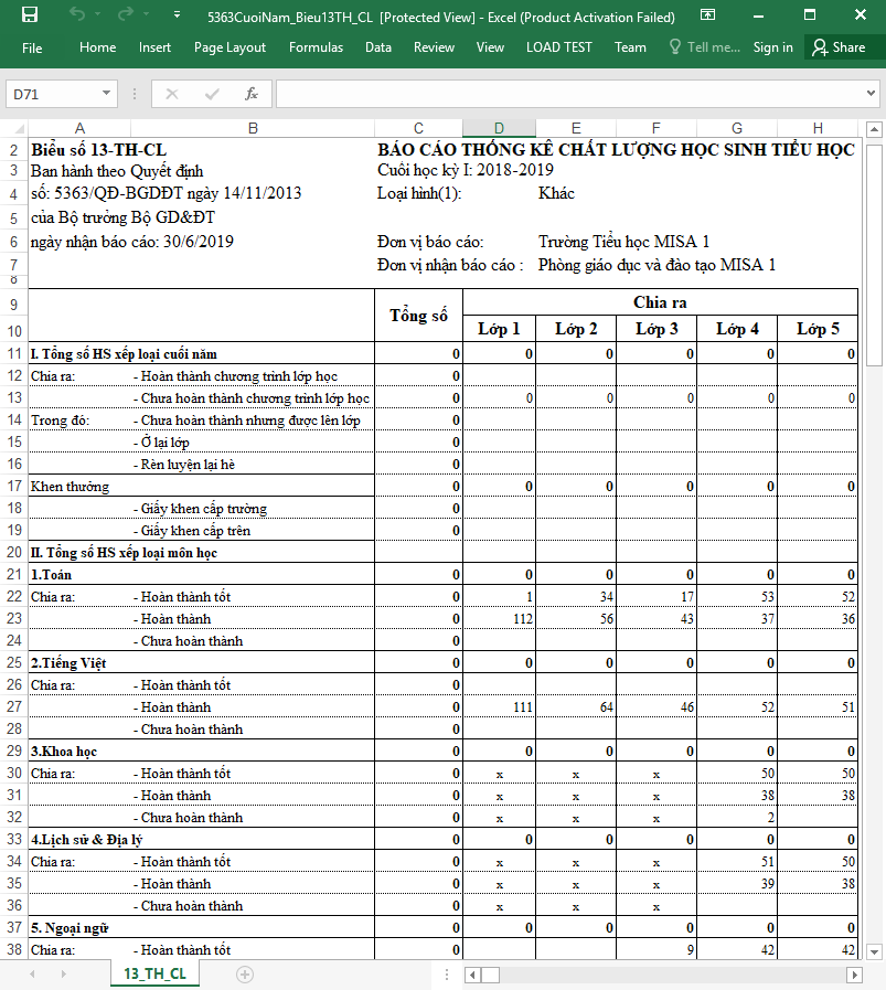 - Trước phiên bản R84, tại cấp Tiểu học, phần mềm chưa đáp ứng mẫu báo cáo này nên hiệu trưởng đang sử dụng mẫu báo cáo Thống kê chất lượng học sinh tiểu học để theo dõi, với những thông tin nào không có thì không lấy lên.