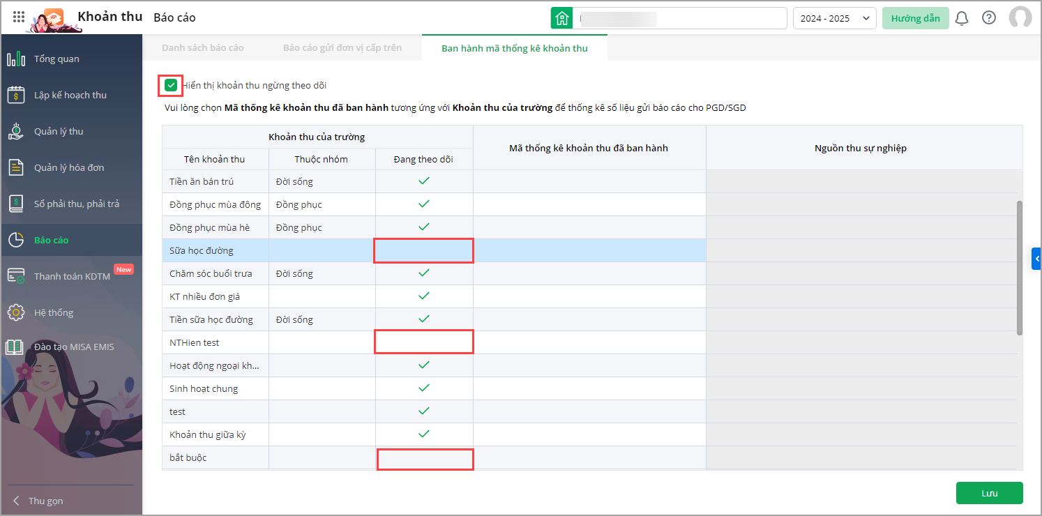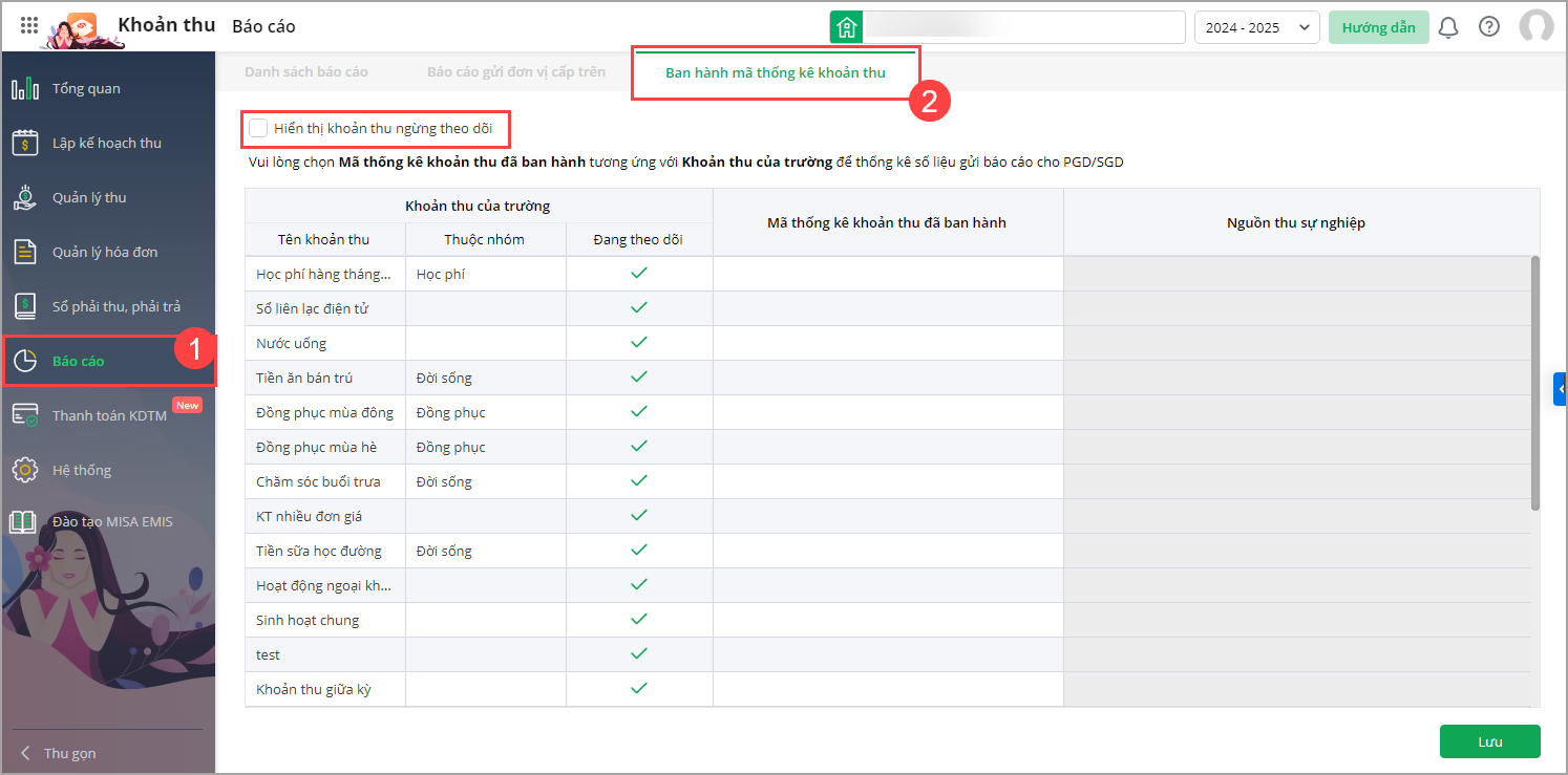 Ví dụ: Tháng 8: Thu khoản Học thêm và có xuất hóa đơn.Tháng 9: Không còn nhu cầu theo dõi khoản thu Học thêm, nên kế toán sẽ ngừng theo dõi khoản thu này.