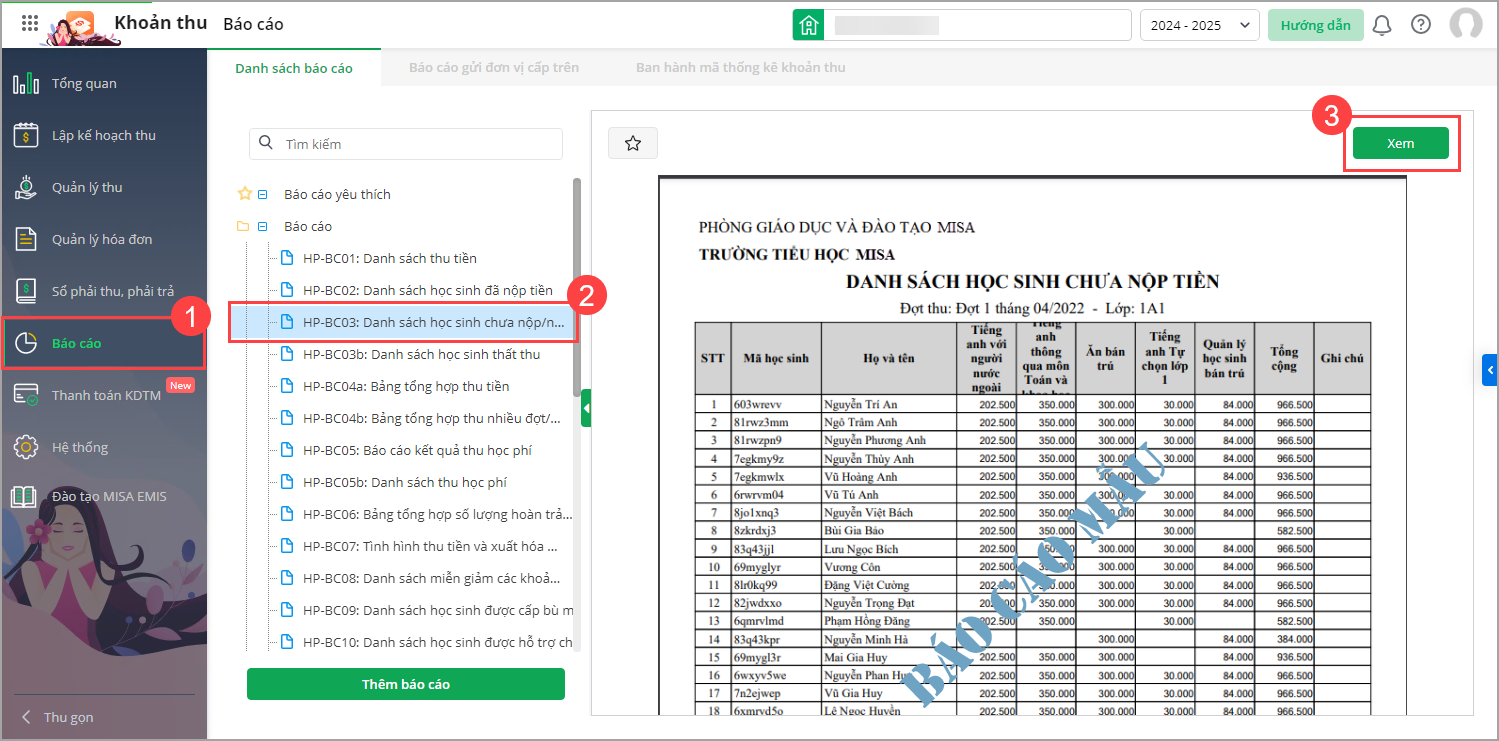 Tại menu Báo cáo\HP-BC03: Danh sách học sinh chưa nộp tiền