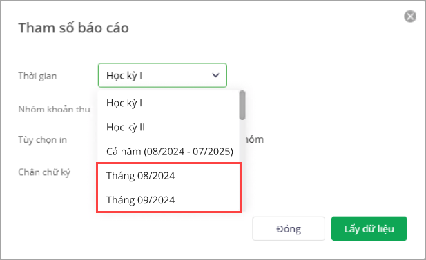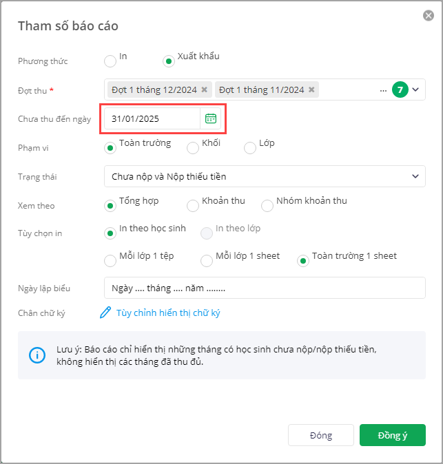 - Khi in hoặc xuất khẩu báo cáo, tại tham số báo cáo bổ sung thông tin Chưa thu đến ngày. Ví dụ: Chưa thu đến ngày 31/01/2025 phần mềm sẽ hiển thị cả học sinh nộp tiền từ 01/02 trở đi