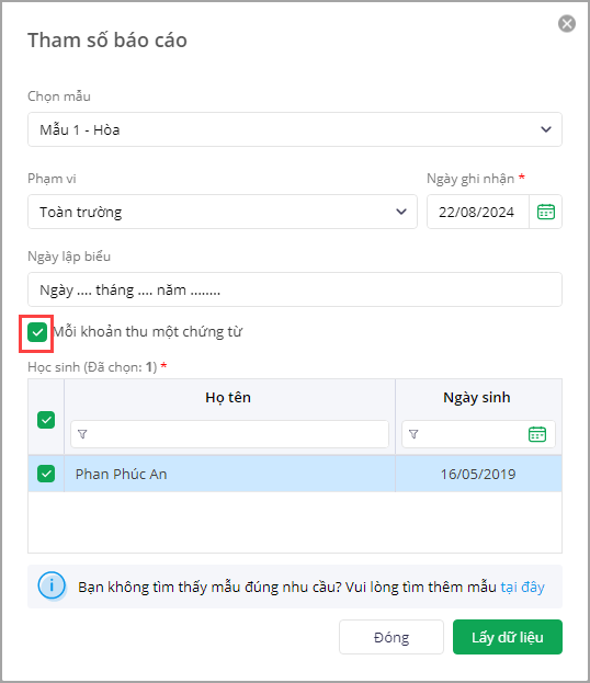 - Nếu tích chọn tùy chọn này, phần mềm sẽ chỉ hiển thị thông tin của một khoản thu duy nhất trên mỗi chứng từ.