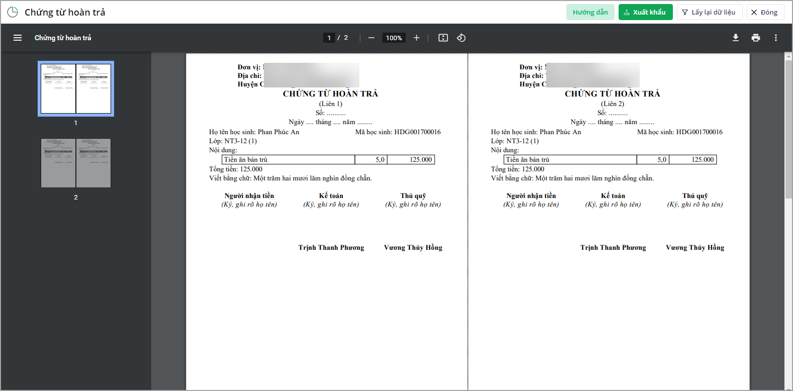 Đơn vị có 3 khoản tiền hoàn trả: Tiền ăn sáng, ăn chính và ăn thứ 7. Mỗi khoản thu được tách thành một sổ quỹ riêng biệt. Cuối năm hoặc khi học sinh nghỉ học, kế toán sẽ tiến hành hoàn trả và lập chứng từ hoàn trả cho từng khoản, giúp việc lưu trữ và hạch toán cho từng quỹ thu trở nên dễ dàng hơn.