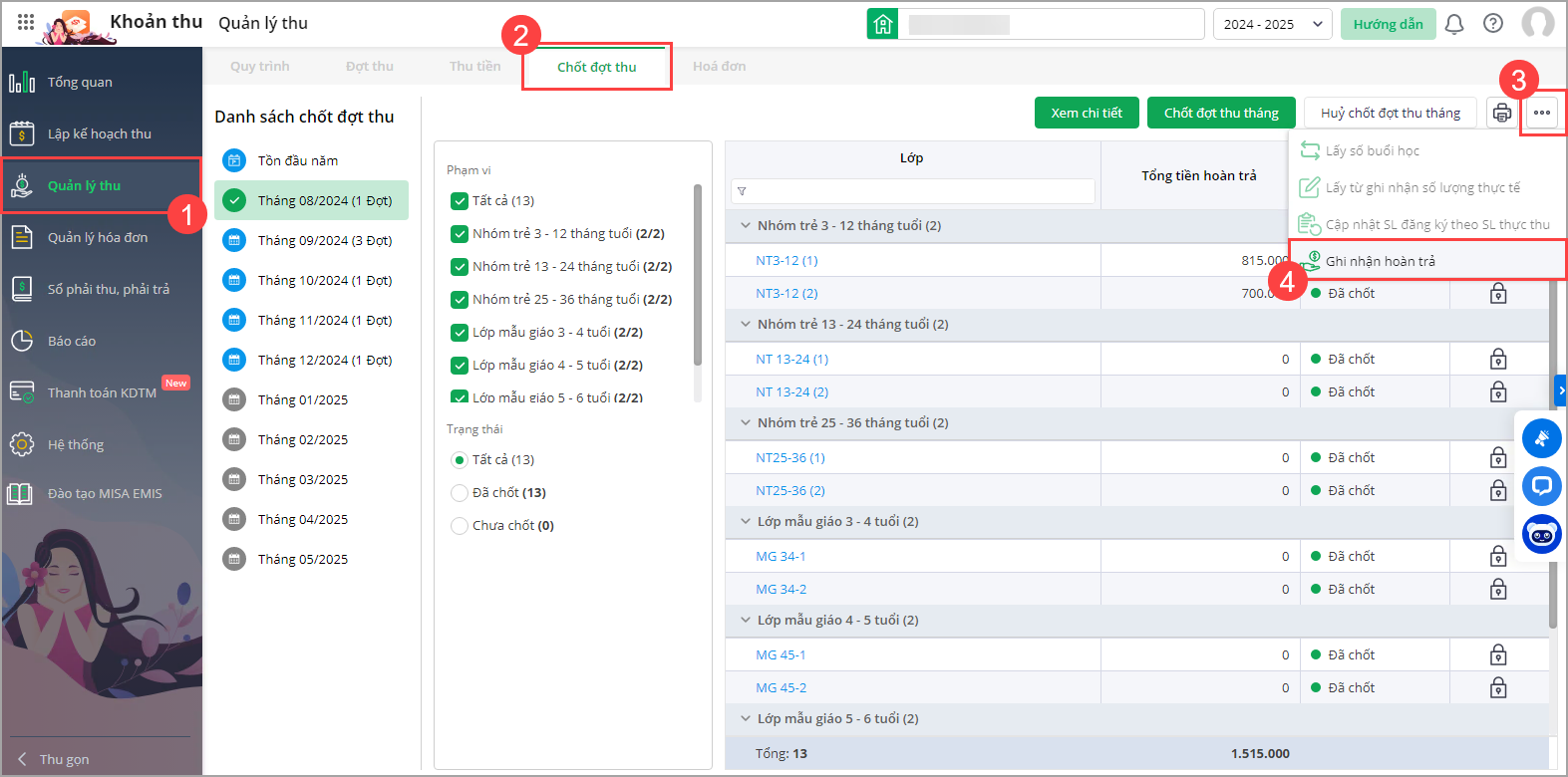 Hoặc tại menu Quản lý thu\Chốt đợt thu\Ghi nhận hoàn trả