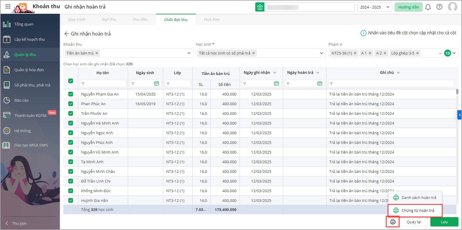 Kế toán có thể lập nhanh chứng từ hoàn trả cho riêng từng khoản thu cho tất cả học sinh để dễ dàng theo dõi tổng số tiền hoàn trả cho từng khoản