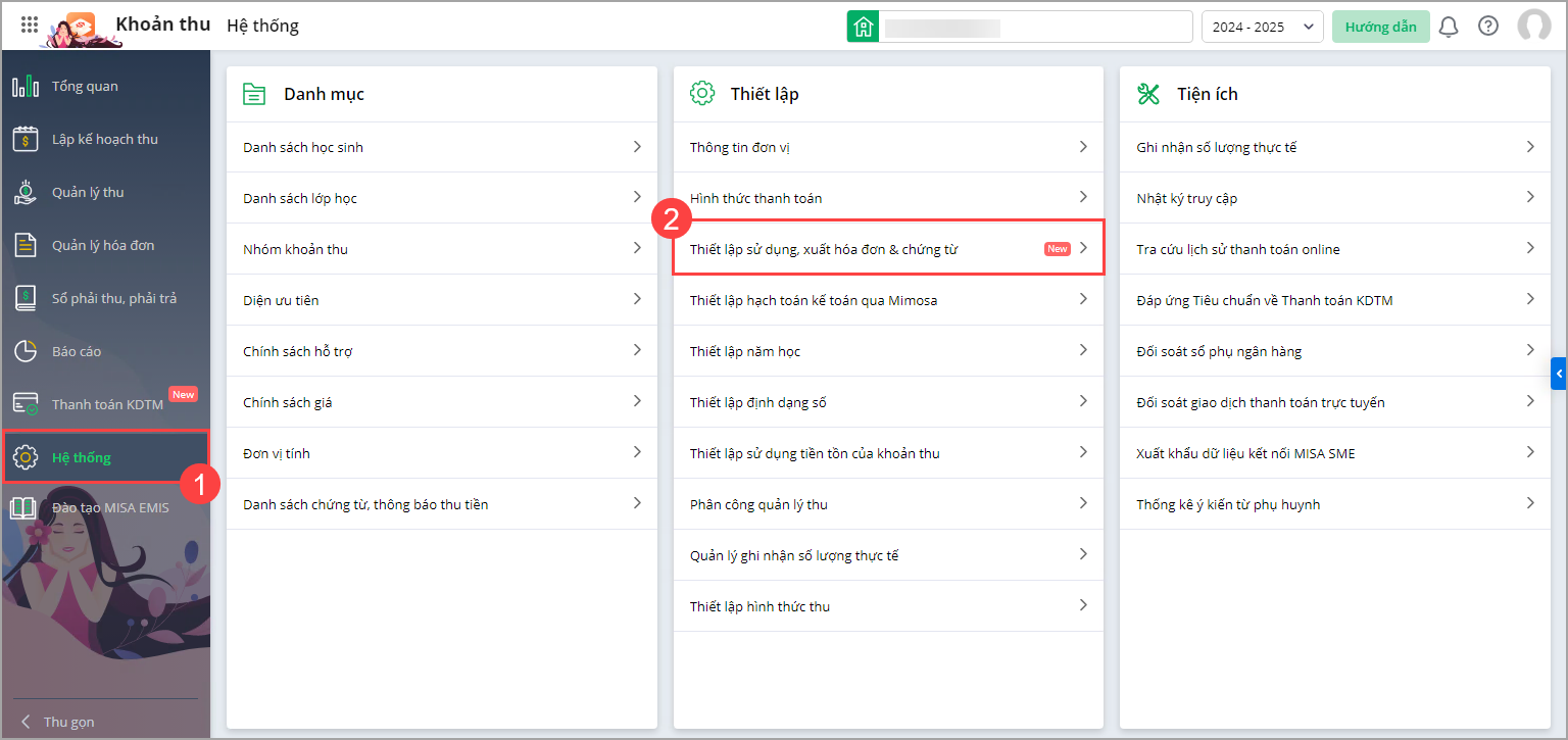 Tại menu Hệ thống\Thiết lập sử dụng, xuất hóa đơn và chứng từ
