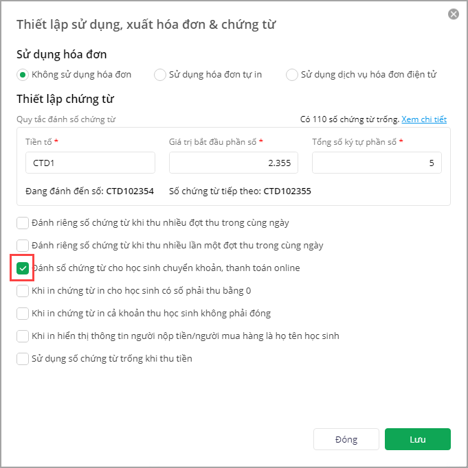 - Phần mềm bổ sung lựa chọn Đánh số chứng từ cho học sinh chuyển khoản, thanh toán online. Nếu tích chọn khi phần mềm tự động gạch nợ cho nhiều học sinh cùng một thời điểm xác nhận thu, mỗi học sinh sẽ được cấp số chứng từ riêng biệt. Số chứng từ sẽ được đánh theo thứ tự tăng dần theo mã học sinh.