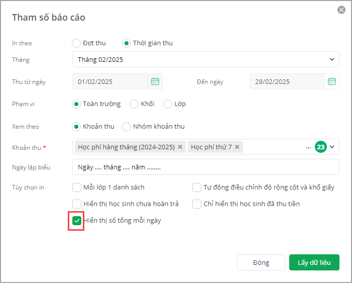 Phần mềm sẽ bổ sung lựa chọn Hiển thị số tổng mỗi ngày.