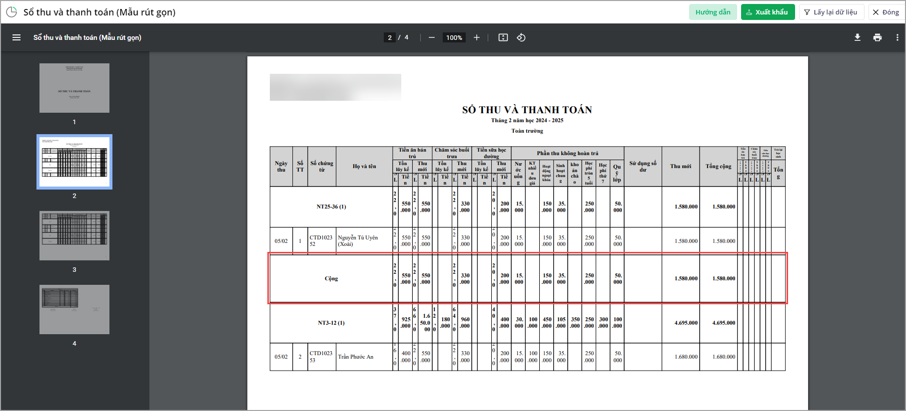 Khi in sổ thu và thanh toán, phần mềm sẽ hiển thị dòng Cộng theo từng ngày và dòng Tổng cộng tất cả các ngày thu tiền và hoàn trả. Tuy nhiên, khi báo cáo lên Phòng tài chính, kế toán muốn tiết kiệm giấy in và chỉ cần hiển thị dòng Tổng cộng theo từng lớp, không cần dòng Cộng theo từng ngày. Điều này khiến kế toán phải mất thời gian xóa thủ công dòng Cộng theo từng ngày.