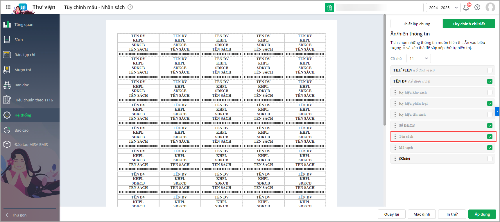 - Bổ sung lựa chọn hiển thị Tên sách: Nếu tích chọn thì sẽ hiển thị Tên sách trên các nhãn sách tối đa 100 ký tự