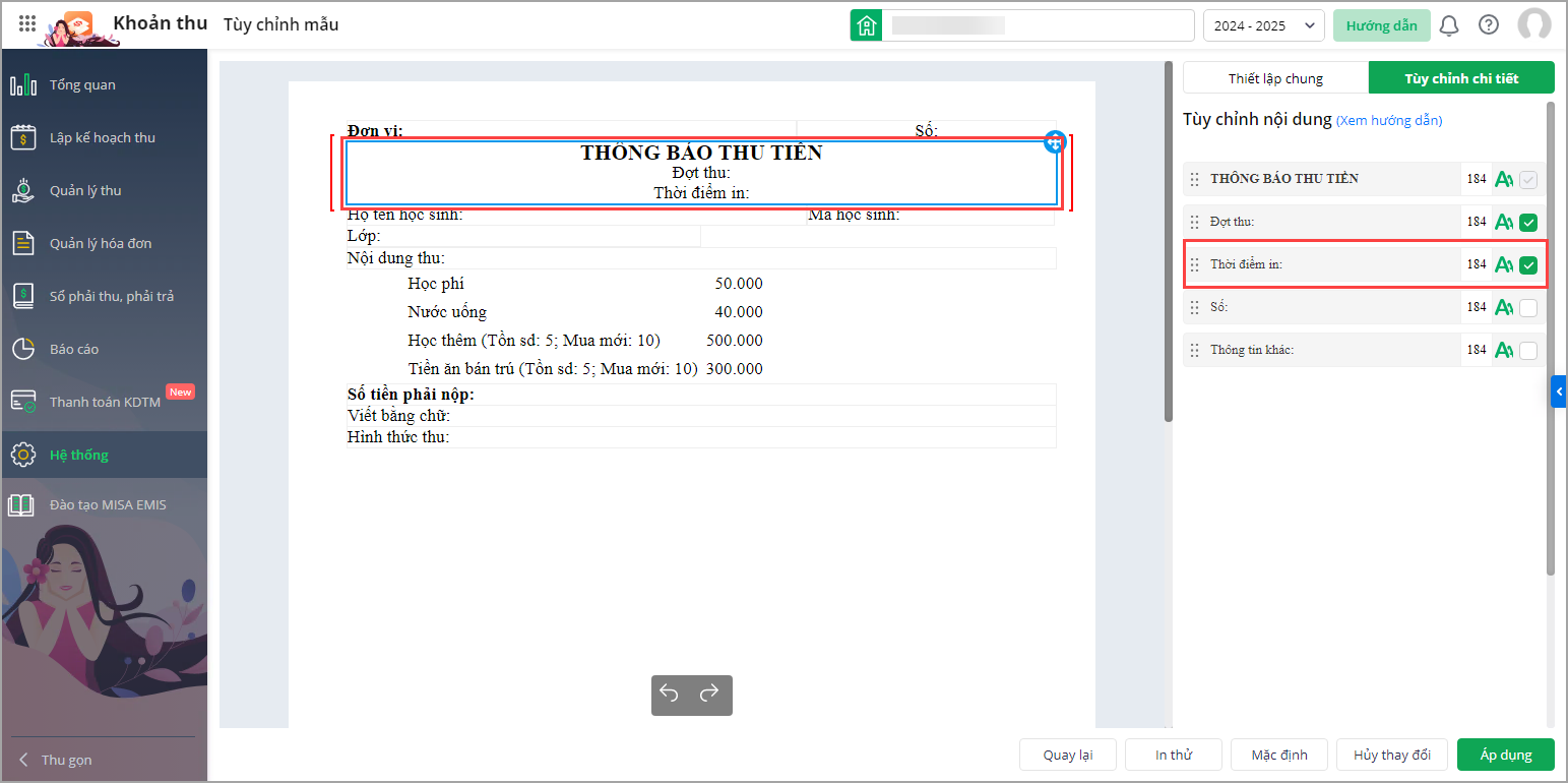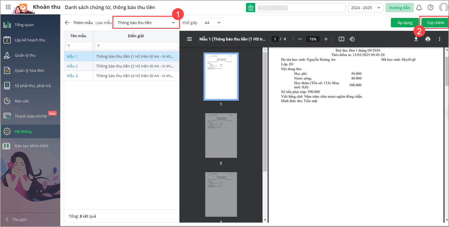 - Phần mềm sẽ có tùy chỉnh mẫu thông báo thu tiền.