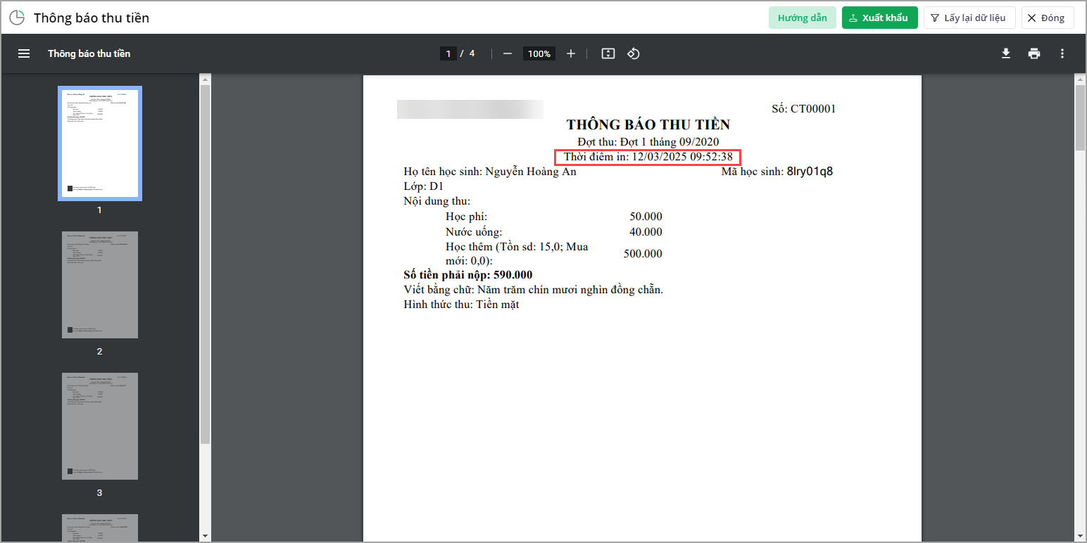 - Phần mềm cung cấp thêm thông tin thời điểm in thông báo thu tiền.