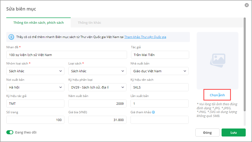 - Khi Thêm hoặc Sửa biên mục, cán bộ thiết bị có thể bổ sung thêm ảnh của sách