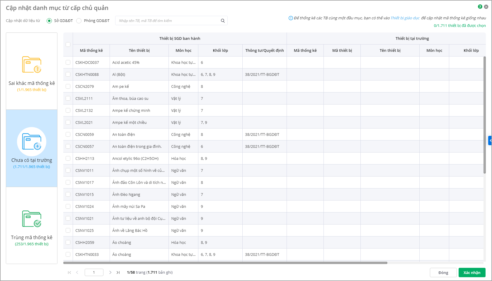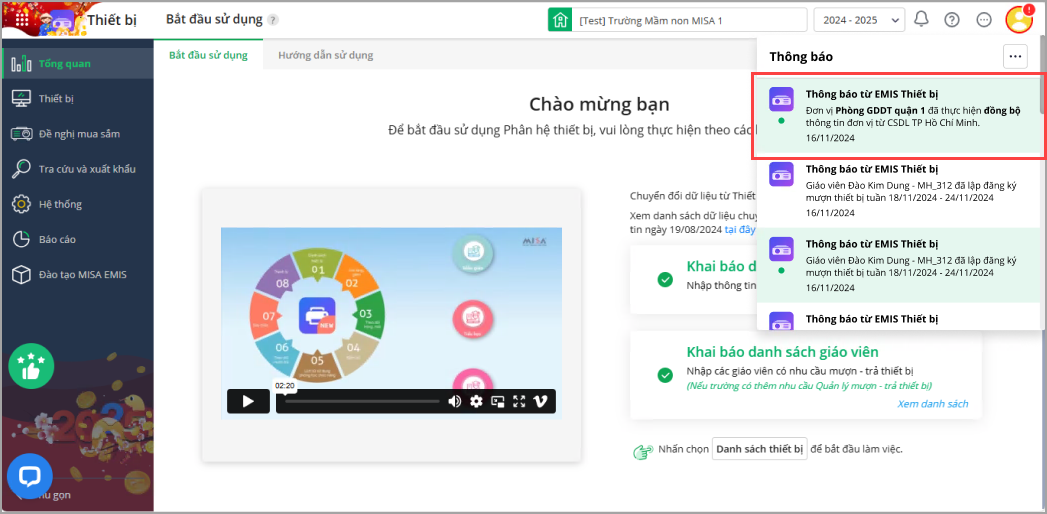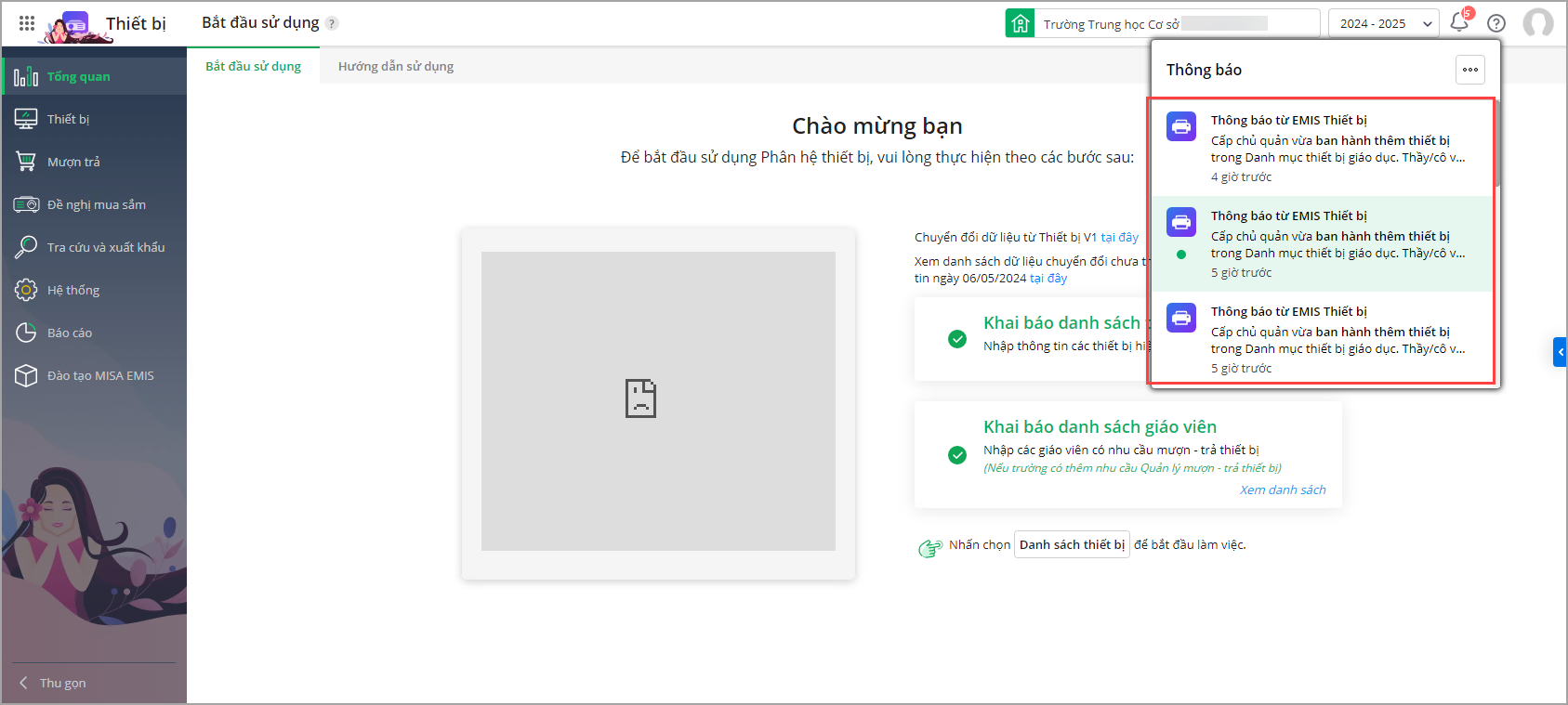 Khi đơn vị chủ quản thêm thiết bị giáo dục hoặc cập nhật danh mục từ cấp chủ quản, các đơn vị trực thuộc sẽ nhận được thông báo.