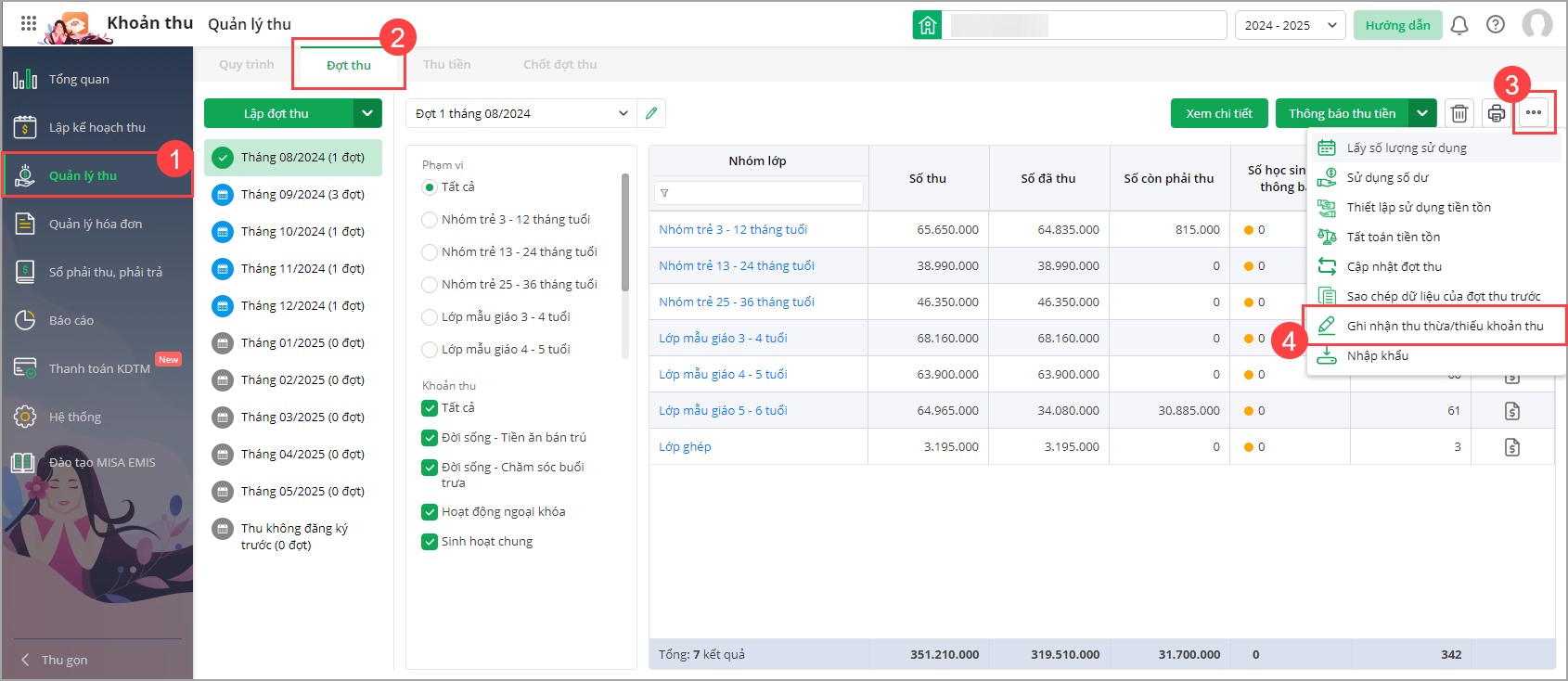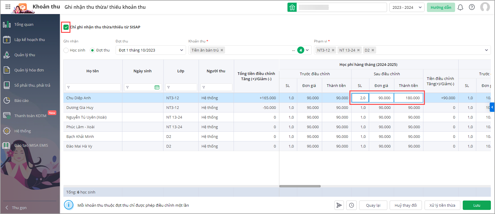 Tại menu Quản lý thu\Đợt thu: Chọn Ghi nhận thu thừa/thiếu khoản thu