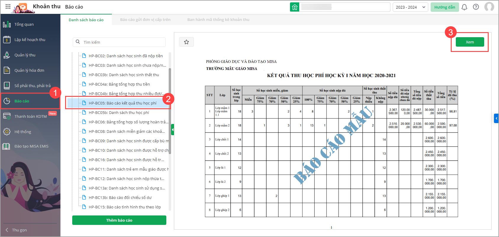 Báo cáo sẽ bao gồm thông tin tổng số tiền đã thu và tổng số tiền hoàn trả của mỗi khoản thu, được phân theo từng lớp.