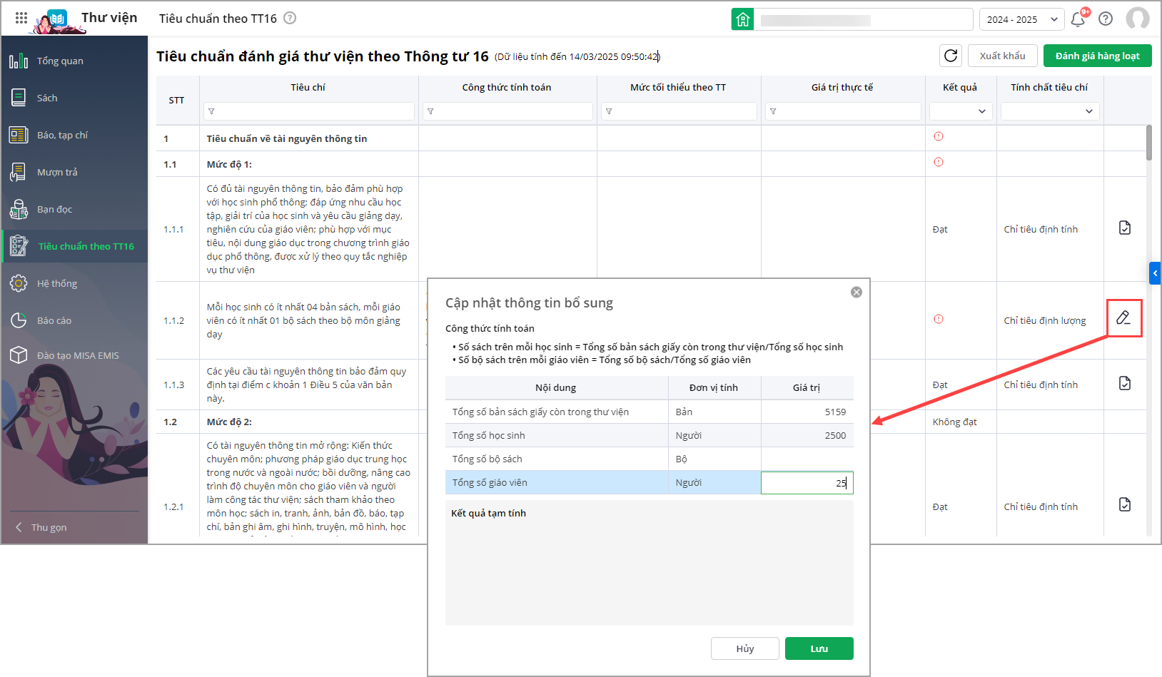 - Với các chỉ tiêu định lượng, anh/chị có thể chọn biểu tượng cây bút để chỉnh sửa thông tin nếu cần thiết. Phần mềm sẽ tự động tính toán và đưa ra kết quả là đạt hoặc không đạt, vì vậy anh/chị không cần phải thực hiện tính toán thủ công.