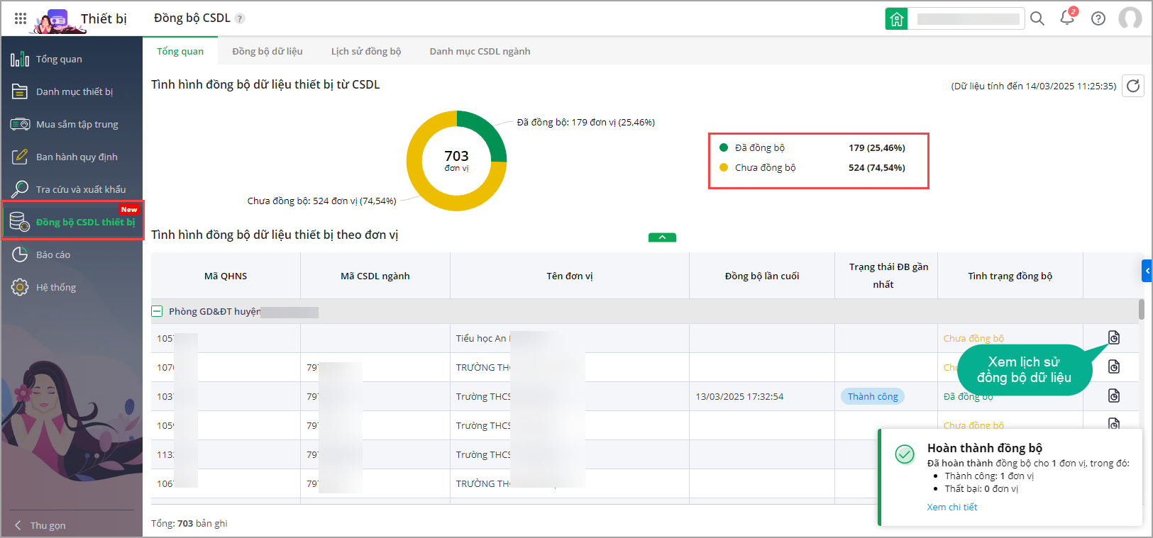 Tại tab Lịch sử đồng bộ, anh/chị có thể xem chi tiết các lần đồng bộ, bao gồm thông tin theo từng đơn vị