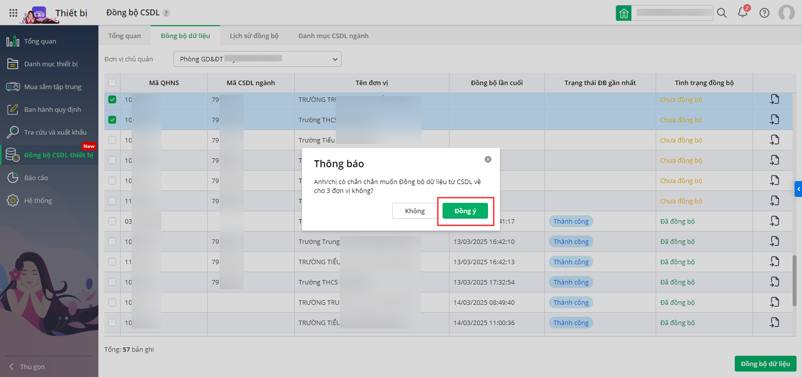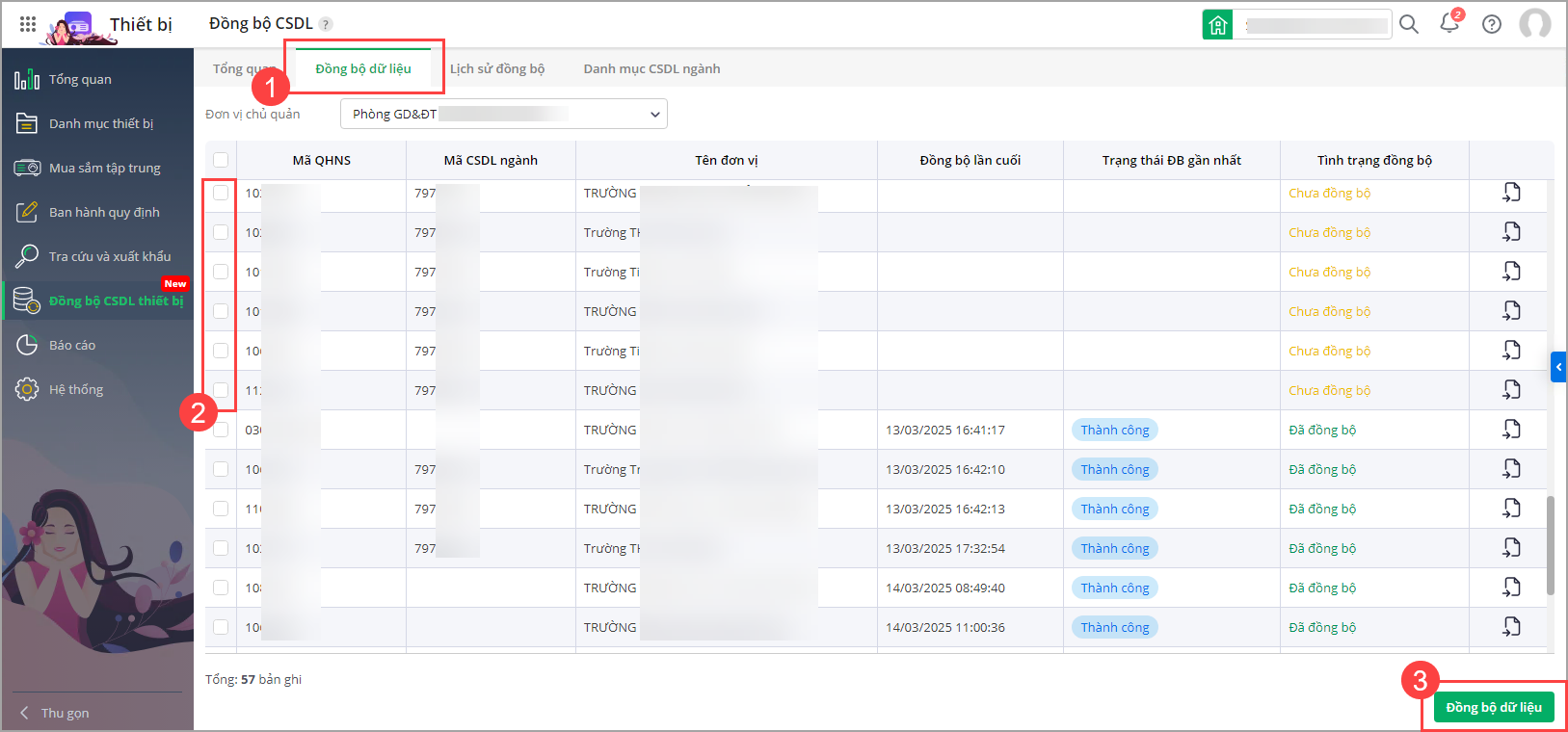 Đối với đơn vị PGD hoặc SGD bổ sung chức năng Đồng bộ CSDL thiết bị