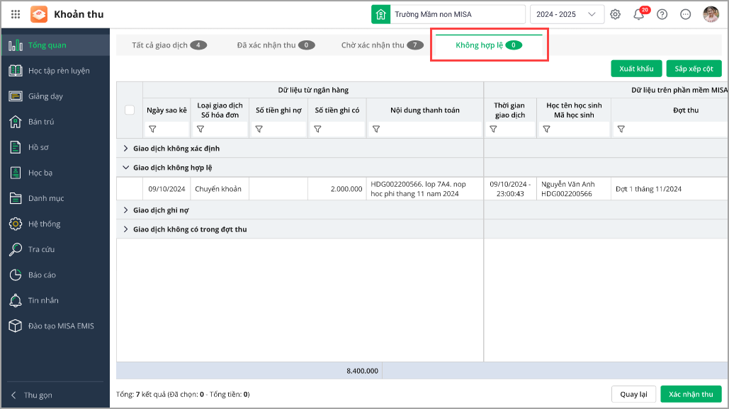 Tab Tất cả giao dịch là tổng các giao dịch: Đã xác nhận thu, chờ xác nhận thu và không hợp lệ