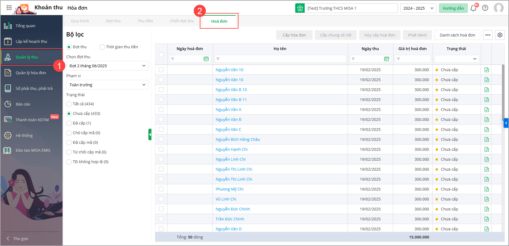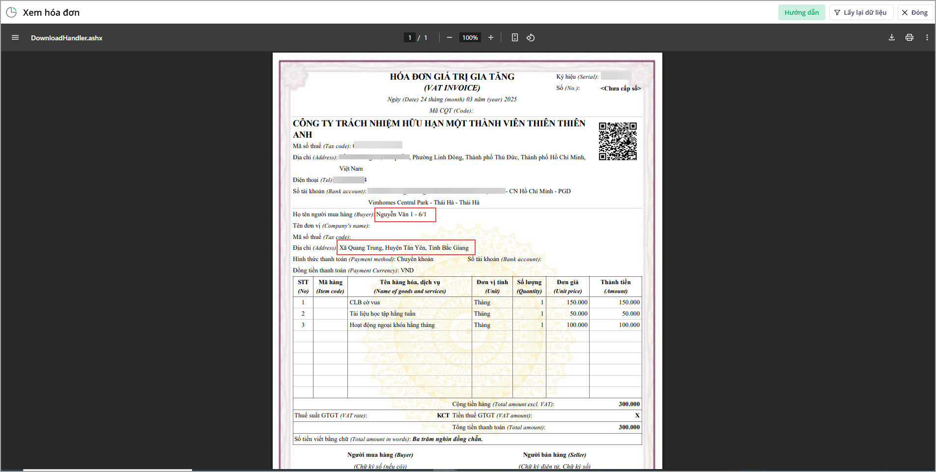 Việc này sẽ giúp đảm bảo dữ liệu đầy đủ khi lấy lên Cục Thuế, bao gồm cả tên và lớp của học sinh.