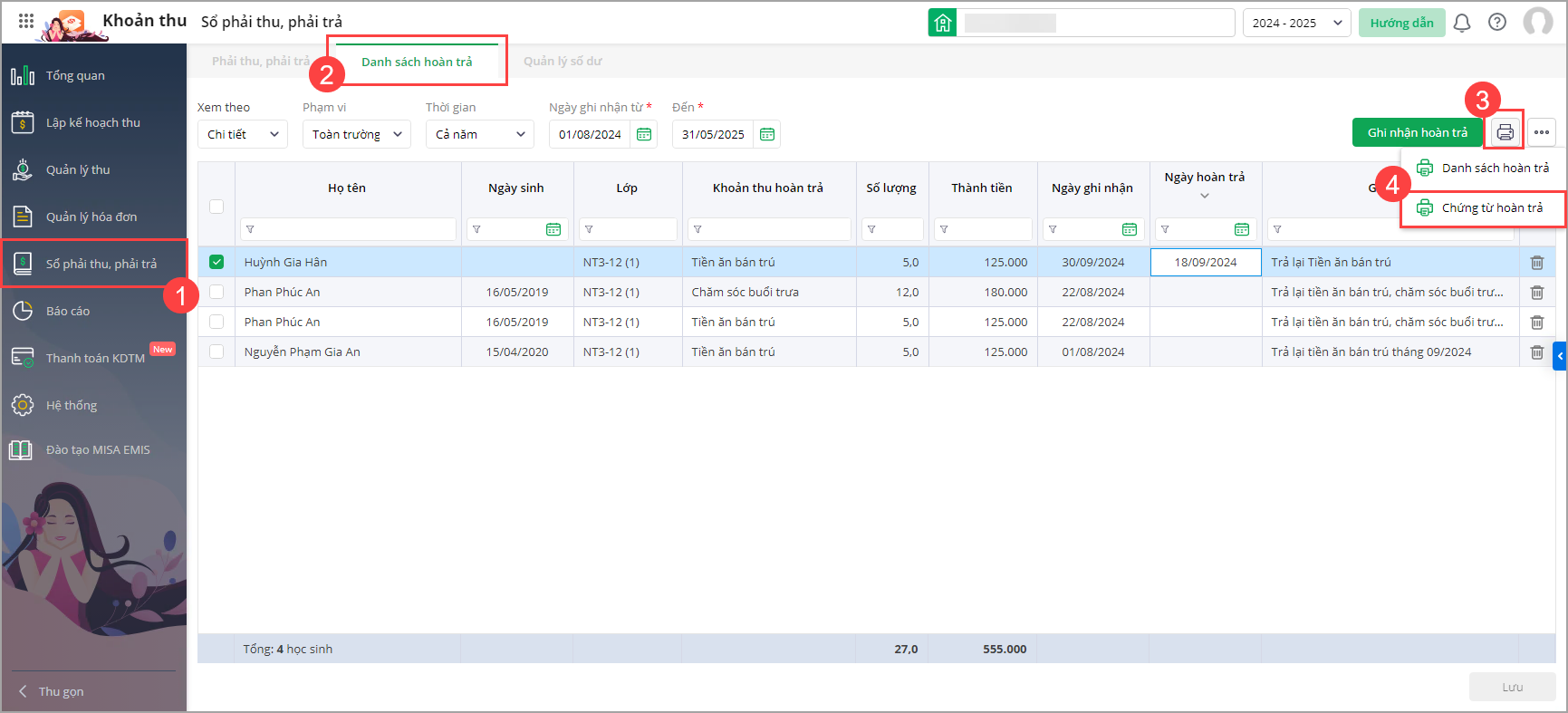 Kế toán có thể lập nhanh chứng từ hoàn trả cho riêng từng khoản thu cho tất cả học sinh để dễ dàng theo dõi tổng số tiền hoàn trả cho từng khoản