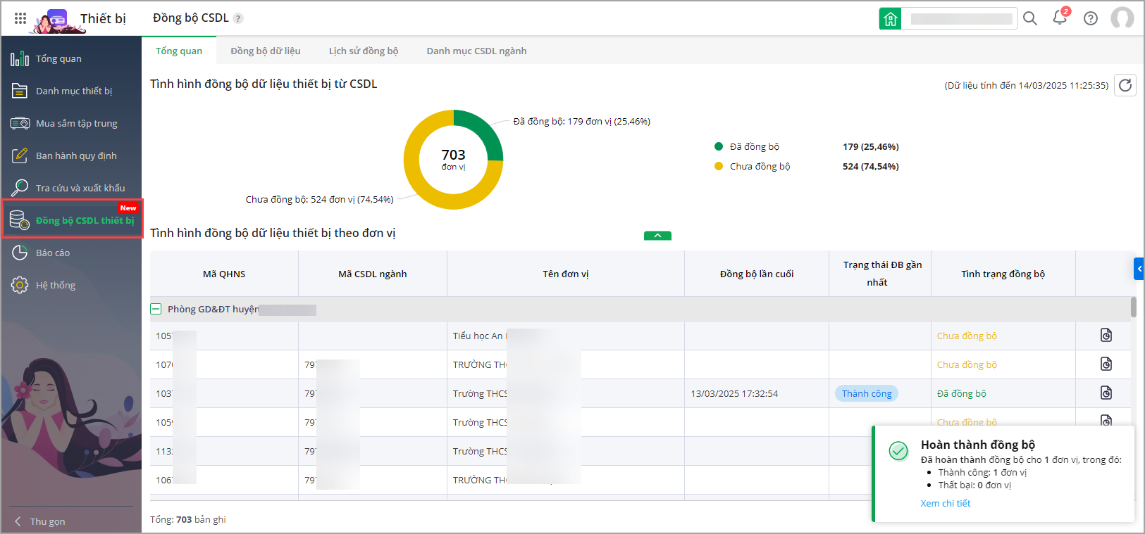 Sau khi PGD/SGD thực hiện đồng bộ xong đơn vị trực thuộc sẽ nhận được thông báo