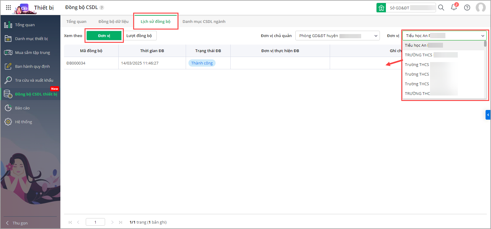 Đối với đơn vị PGD hoặc SGD bổ sung chức năng Đồng bộ CSDL thiết bị