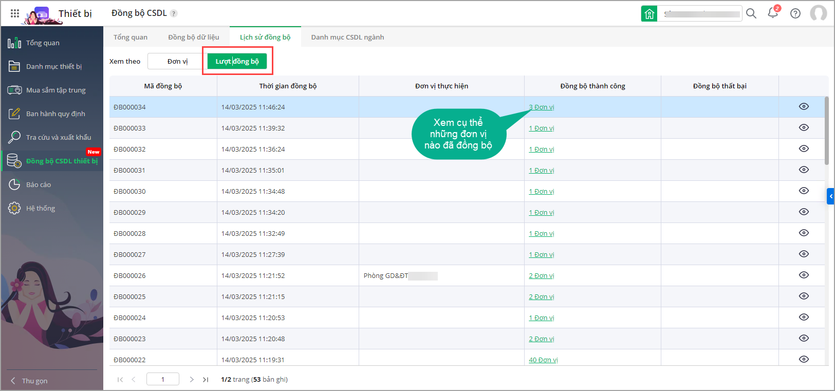 Tại tab Lịch sử đồng bộ, anh/chị có thể xem chi tiết các lần đồng bộ, bao gồm thông tin theo từng đơn vị