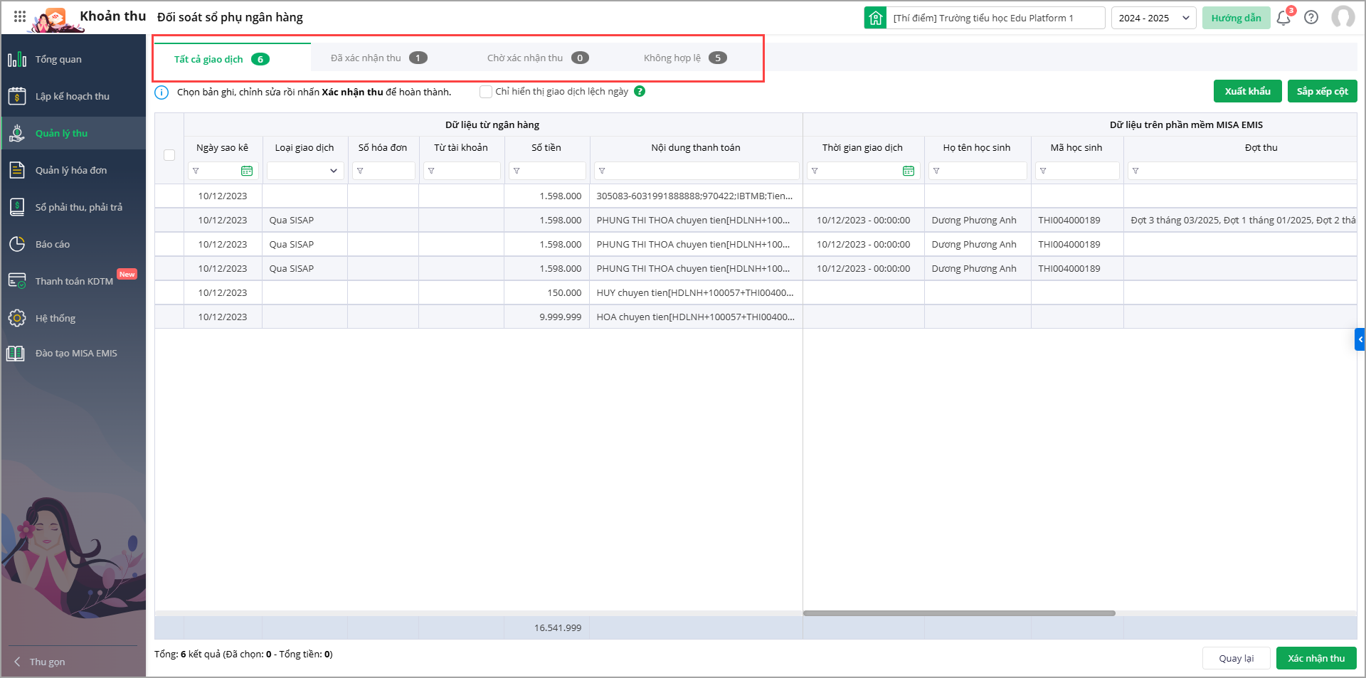 Tab Tất cả giao dịch là tổng các giao dịch: Đã xác nhận thu, chờ xác nhận thu và không hợp lệ