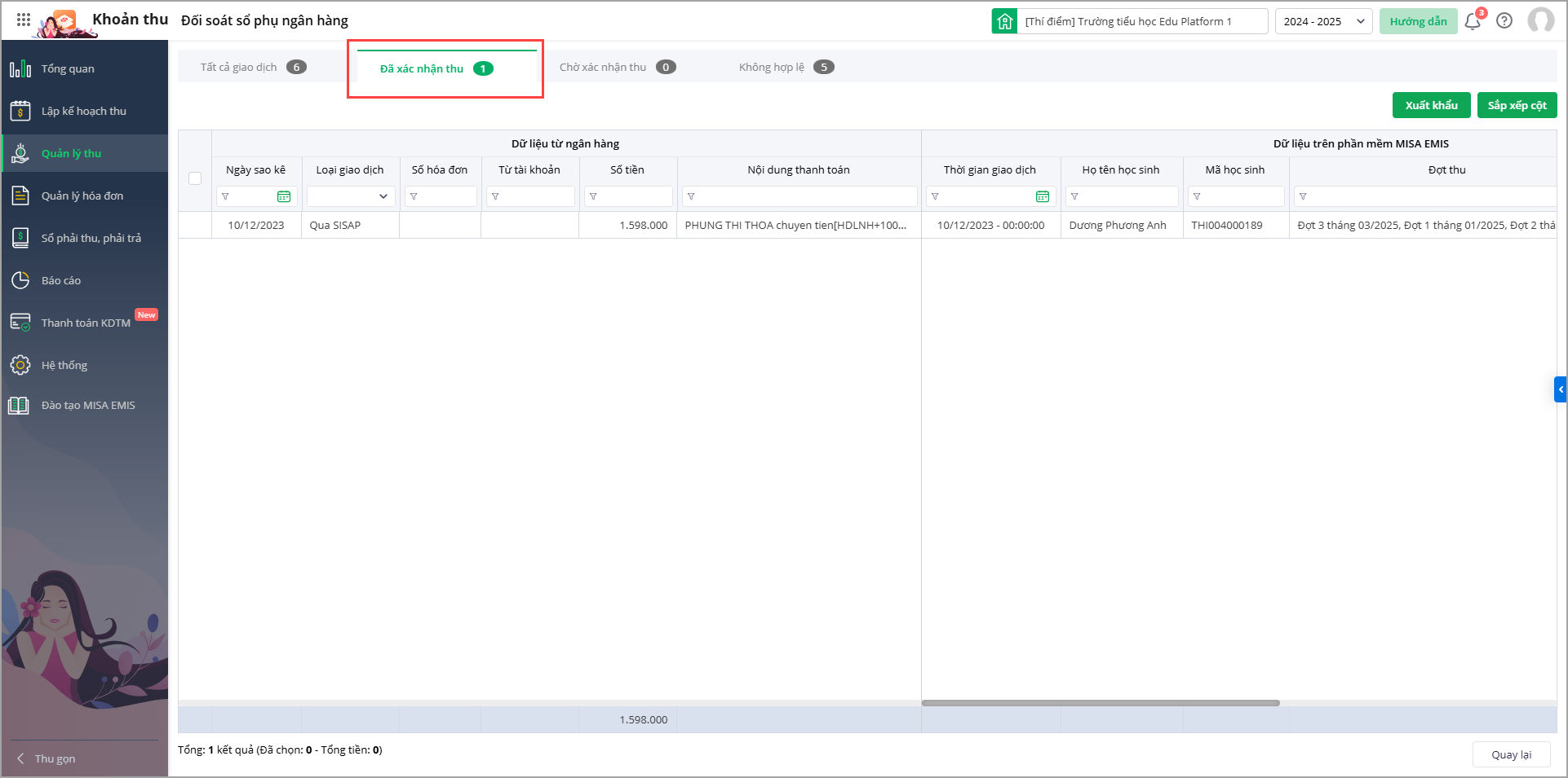 Tab Đã xác nhận thu hiển thị các giao dịch mà phần mềm đã tự động kiểm tra và xác nhận rằng học sinh đã thanh toán học phí thành công.