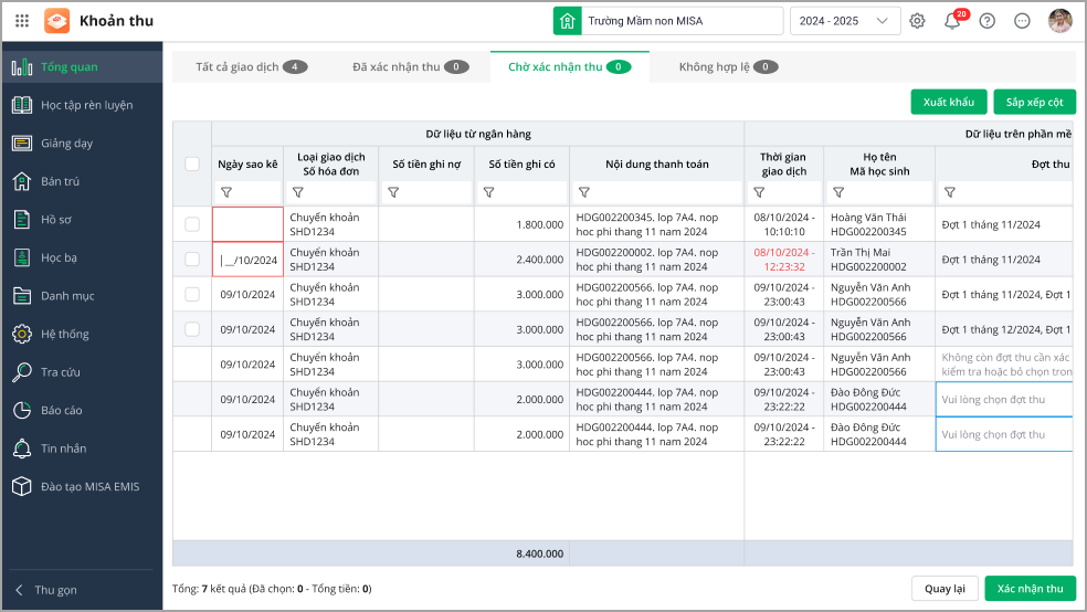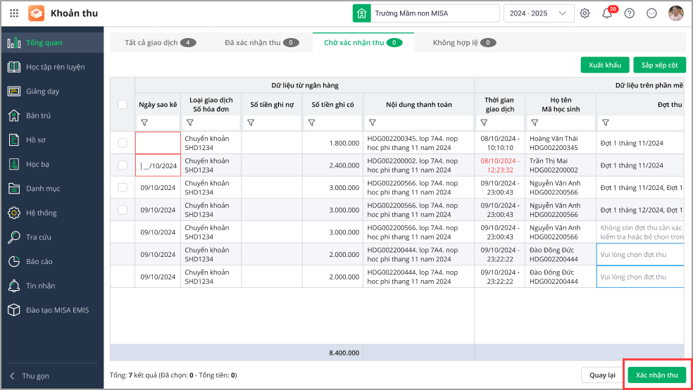 Sau khi bổ sung đầy đủ thông tin, anh/chị hãy chọn giao dịch cần xác nhận, rồi nhấn Xác nhận thu để hoàn tất việc xác nhận học phí cho học sinh.