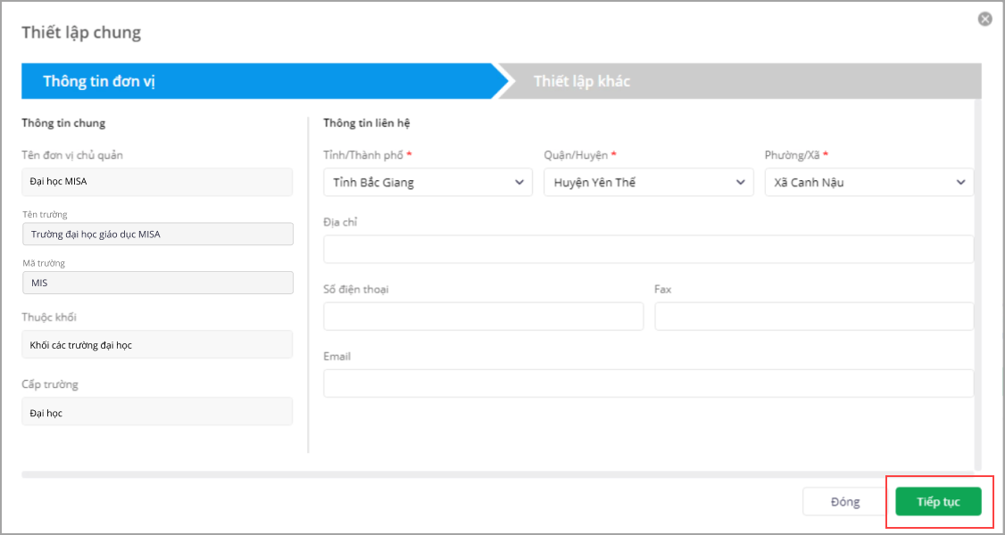 - Tại màn hình Thiết lập chung, anh/chị thực hiện khai báo các thông tin của đơn vị mình: Thông tin chung, Thông tin liên hệ.
