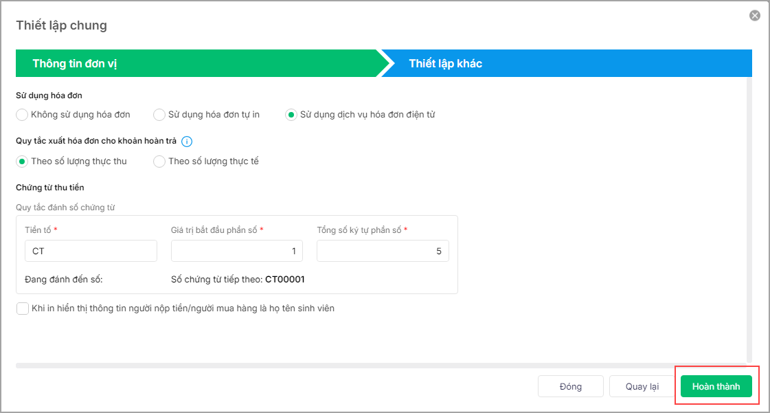 - Bỏ tích chọn tại phần Khi in hiển thị thông tin người nộp tiền/Người mua hàng là họ tên học sinh nếu ở trường người nộp tiền là phụ huynh hoặc người nộp không phải là học sinh.