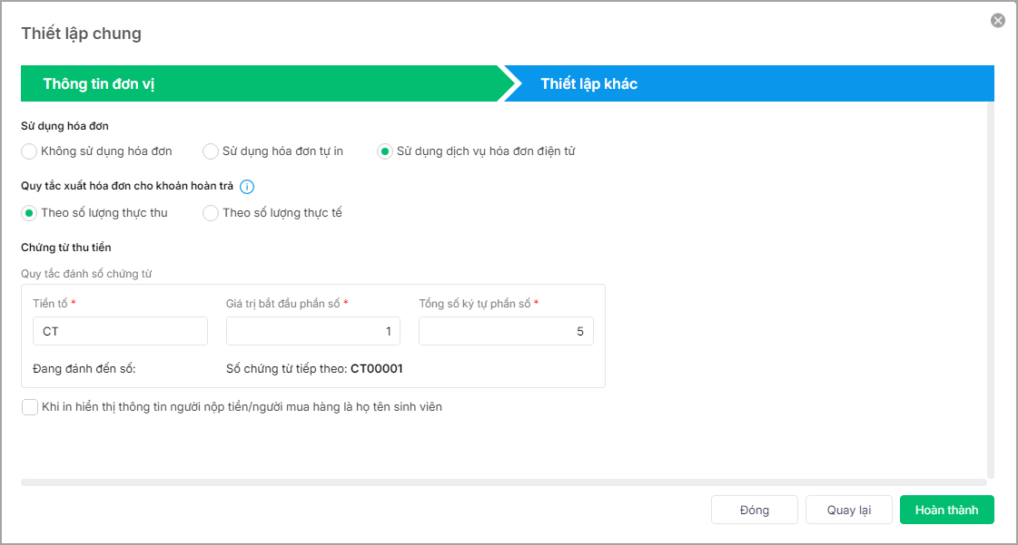 Mục đích: Giúp đơn vị khai báo các thông tin chung của đơn vị: địa chỉ, tên đơn vị chủ quản, tên trường, mã trường, thuộc khối, cấp trường, thông tin liên hệ (tỉnh, thành phố, phường xã, địa chỉ, số điện thoại, email, fax, thiết lập sử dụng hóa đơn, quy tắc xuất hóa đơn cho khoản hoàn trả, khi bắt đầu sử dụng phần mềm