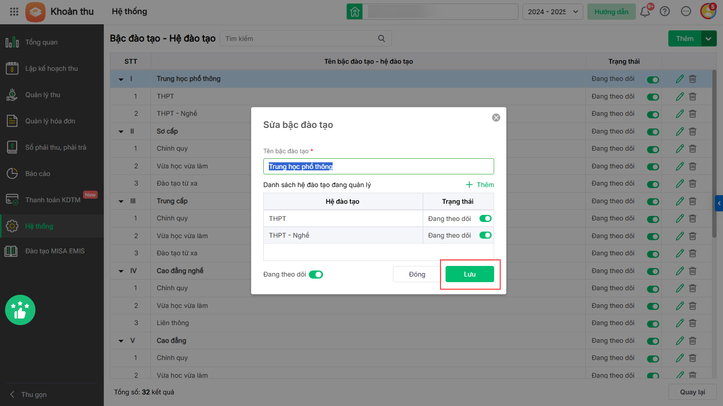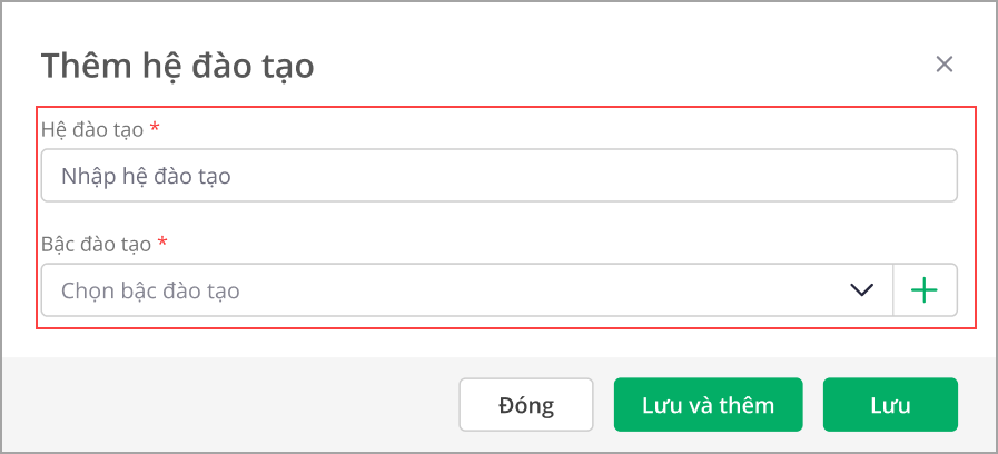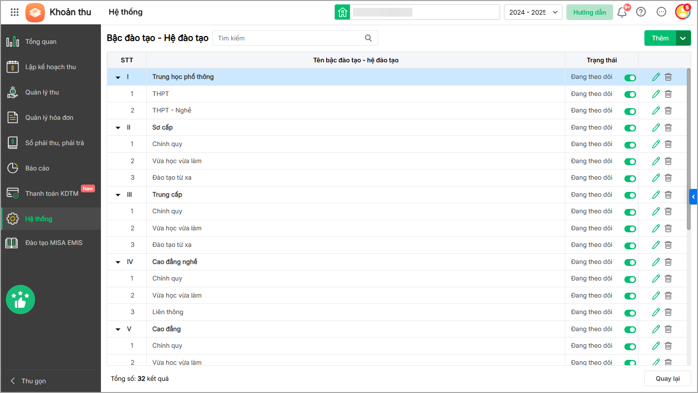 Mục đích: Khai báo danh mục bậc và hệ đào tạo để phân loại, quản lý và theo dõi các chương trình đào tạo phù hợp với từng cấp độ và hình thức học.