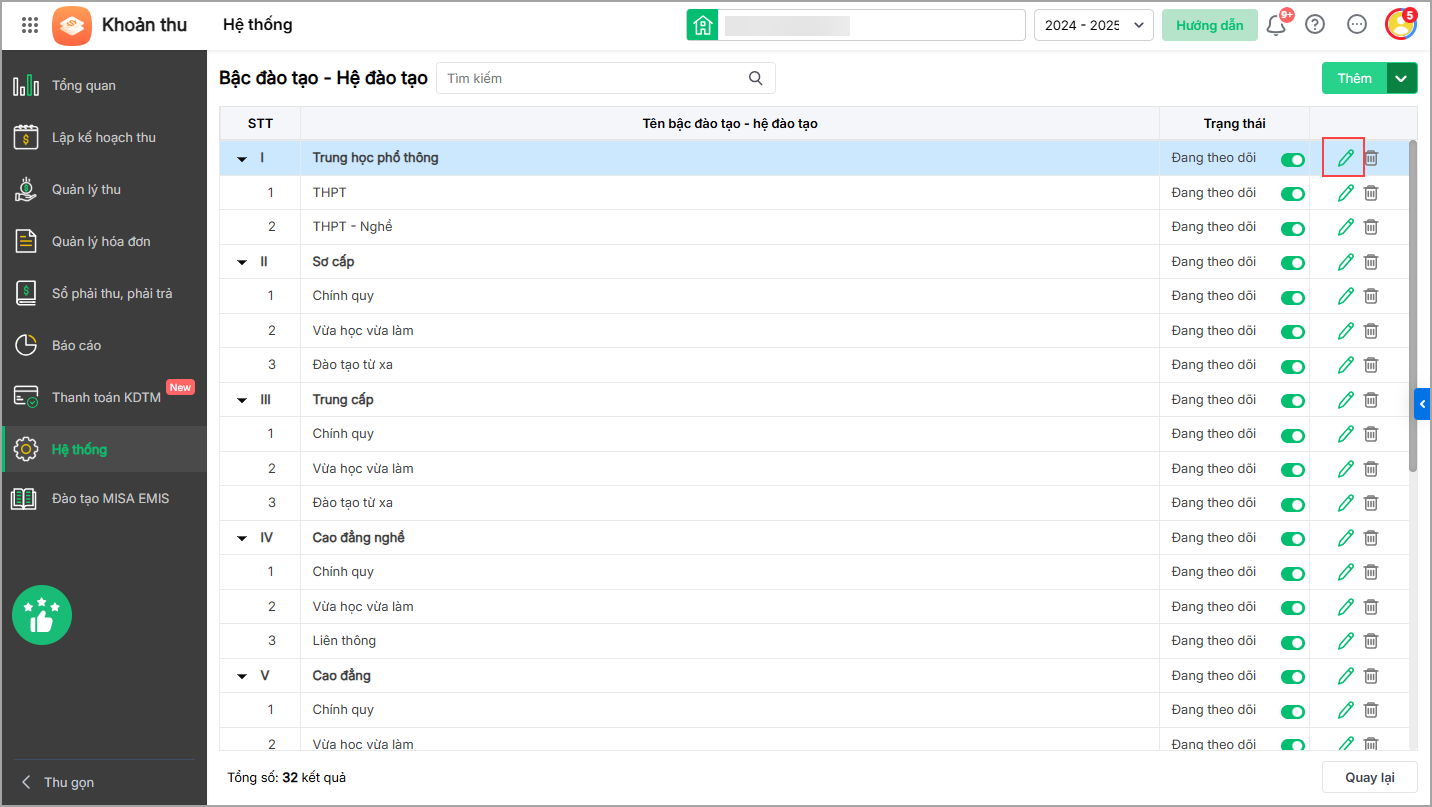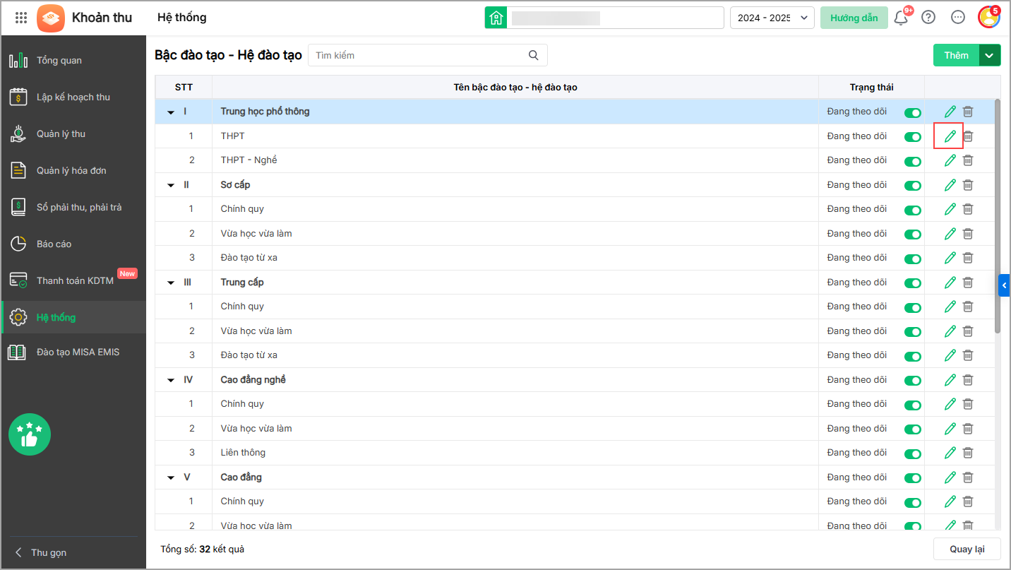 - Để chỉnh sửa thông tin của bậc đào tạo, nhấn biểu tượng chiếc bút hoặc nhấp đúp chuột tại thông tin bậc đào tạo.