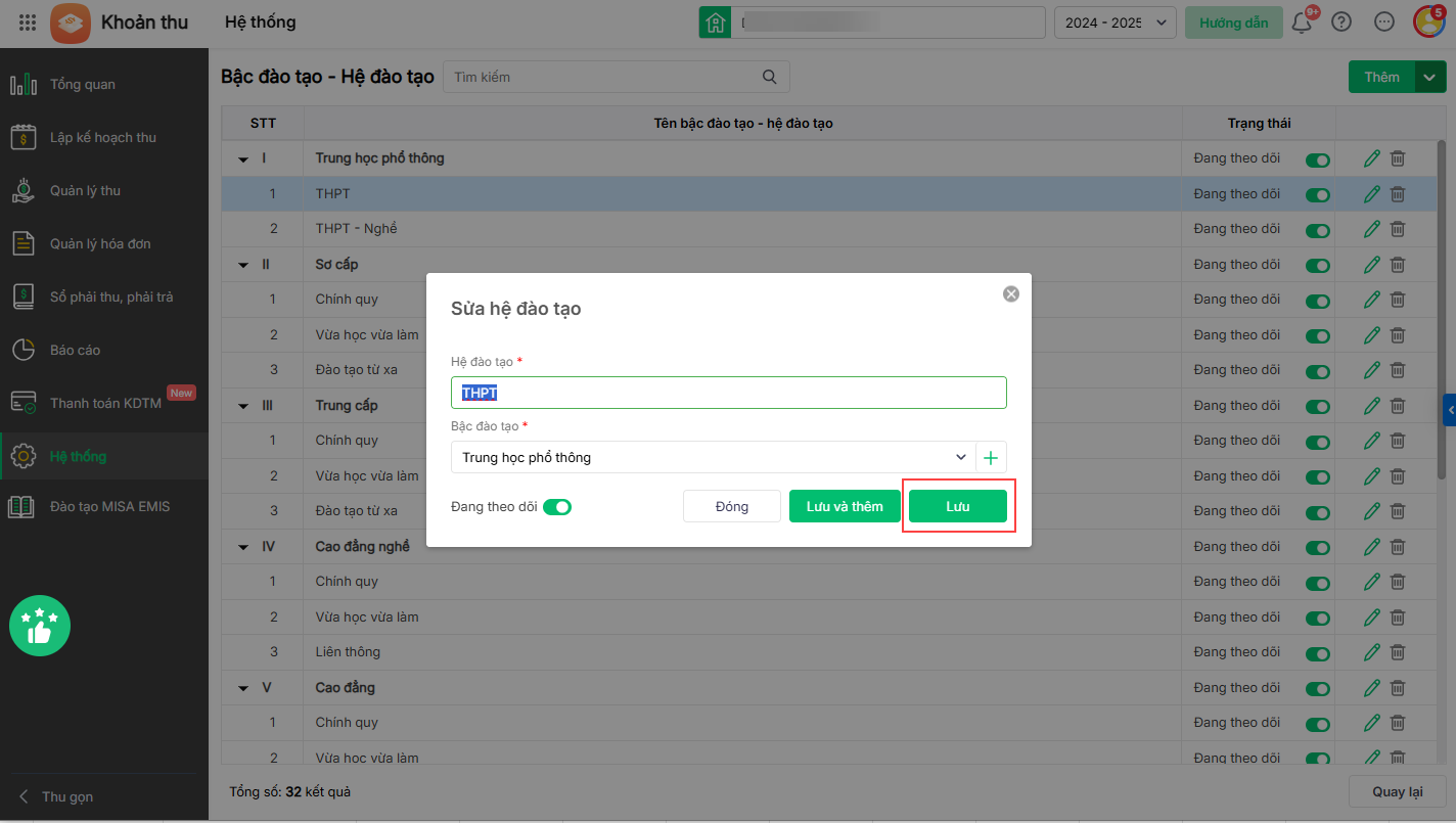 - Vào Hệ thống\Bậc đào tạo – Hệ đào tạo
