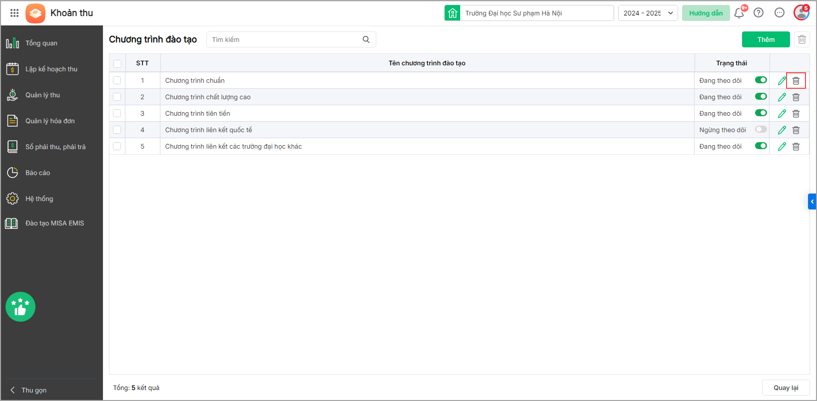 - Để xóa Chương trình đào tạo ra khỏi hệ thống, anh/chị chọn biểu tượng thùng rác