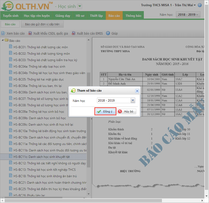 3. Trên tham số báo cáo, lựa chọn năm học cần in báo cáo.