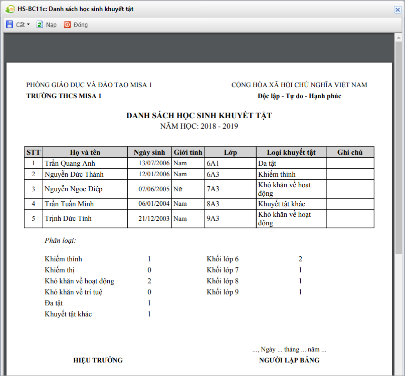 Giúp hiệu trưởng có thể nhanh chóng thống kê được danh sách tất cả các học sinh khuyết tật trong trường.