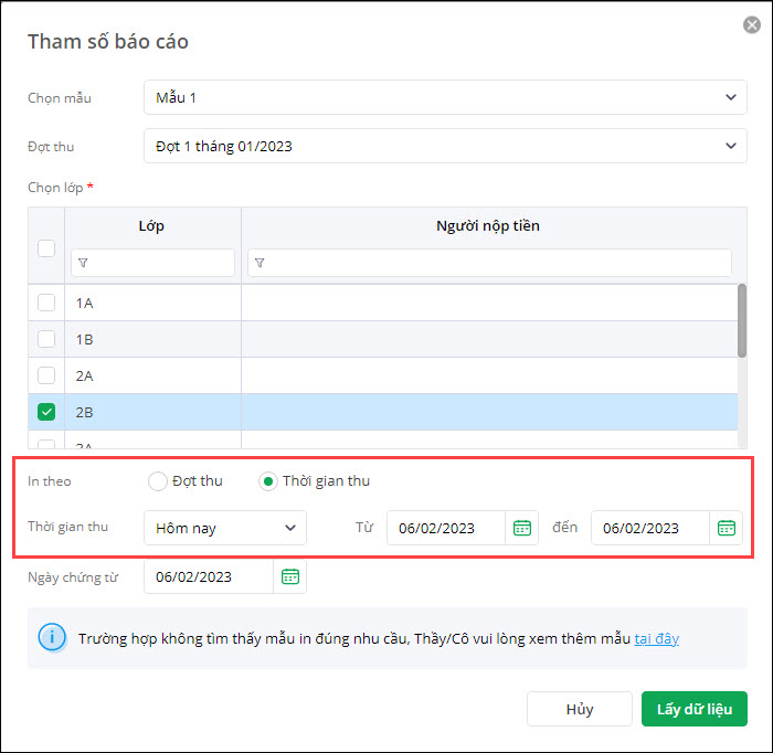 - Chọn lớp cần in và nhấn biểu tượng máy in, chọn loại Chứng từ thu tiền.