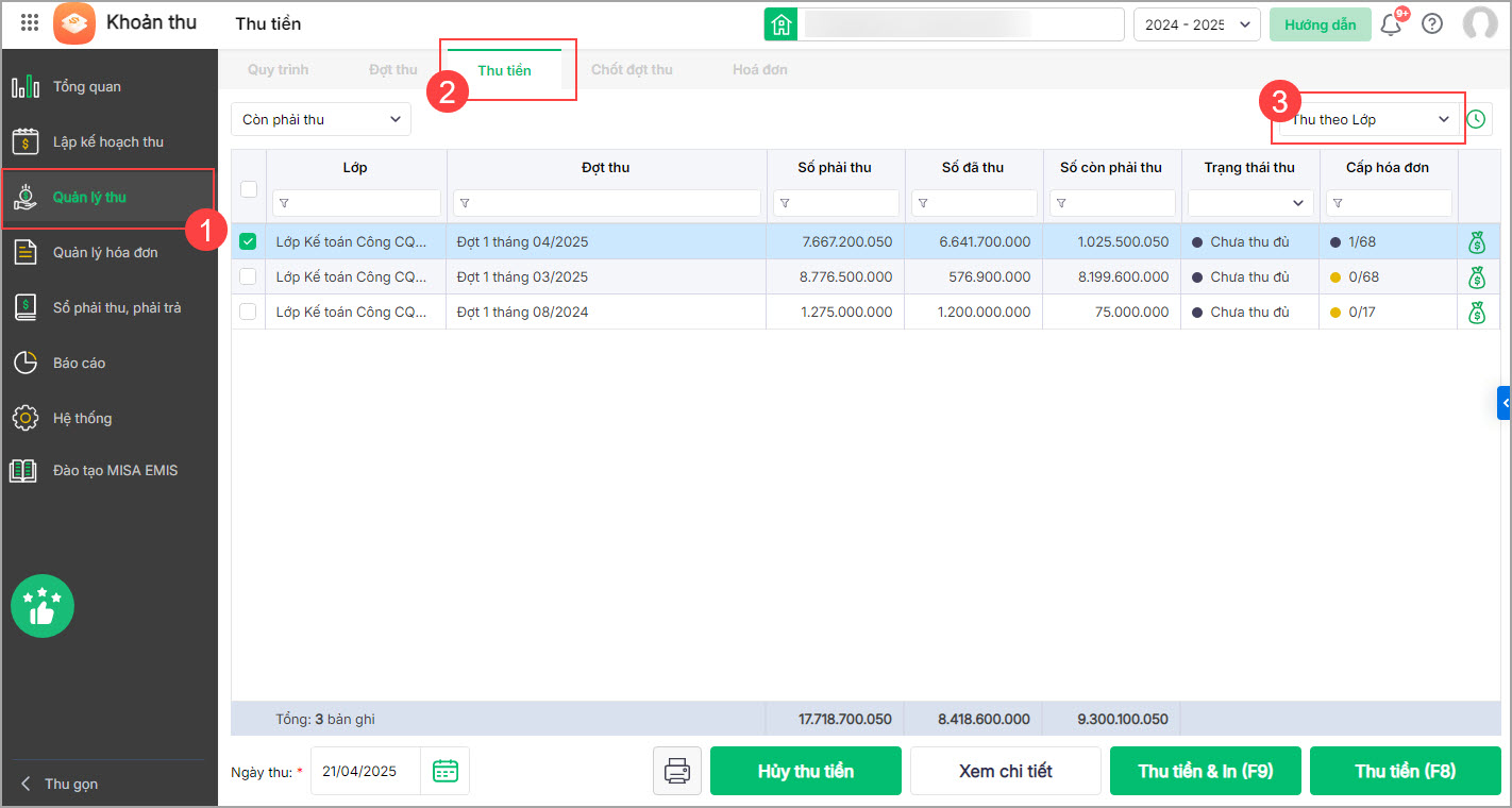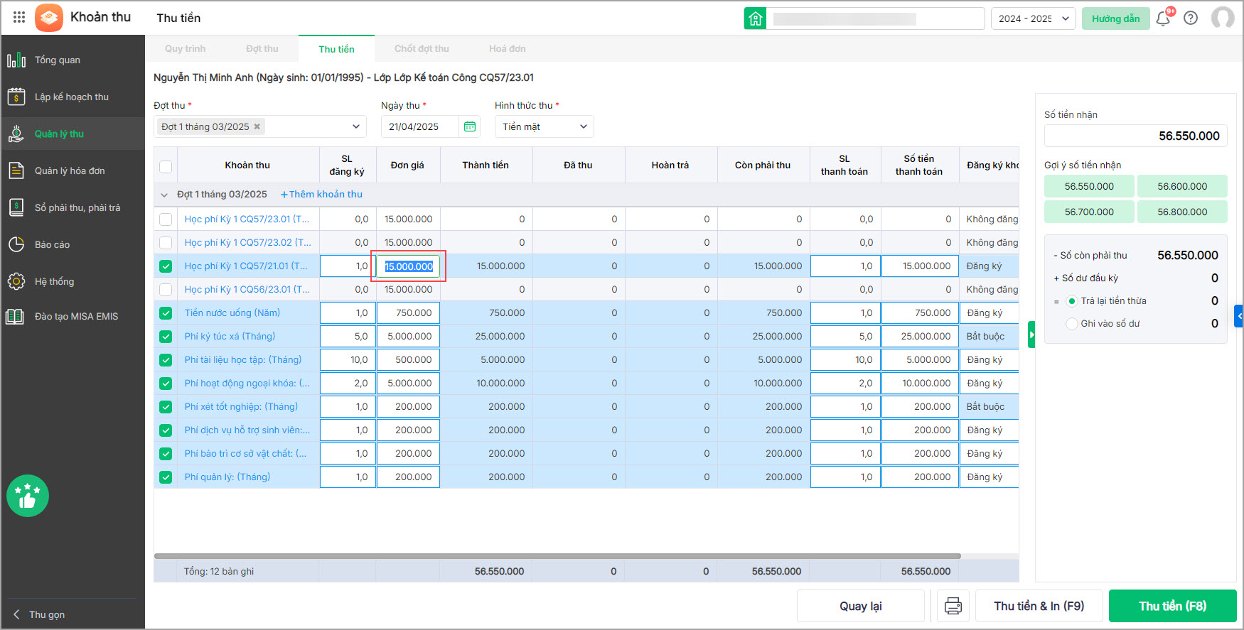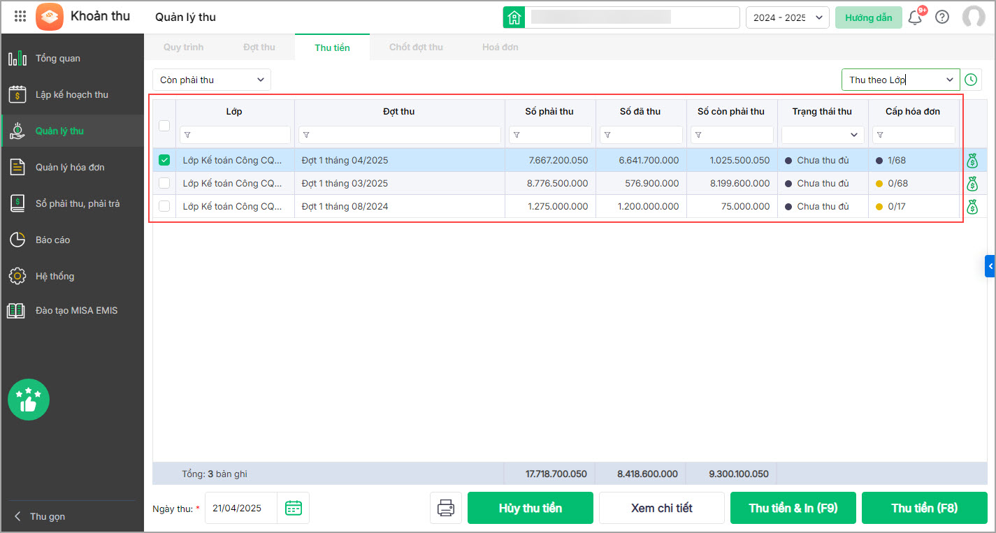 - Anh/chị thực hiện thu tiền nhanh cho các lớp, các đợt thu như sau: