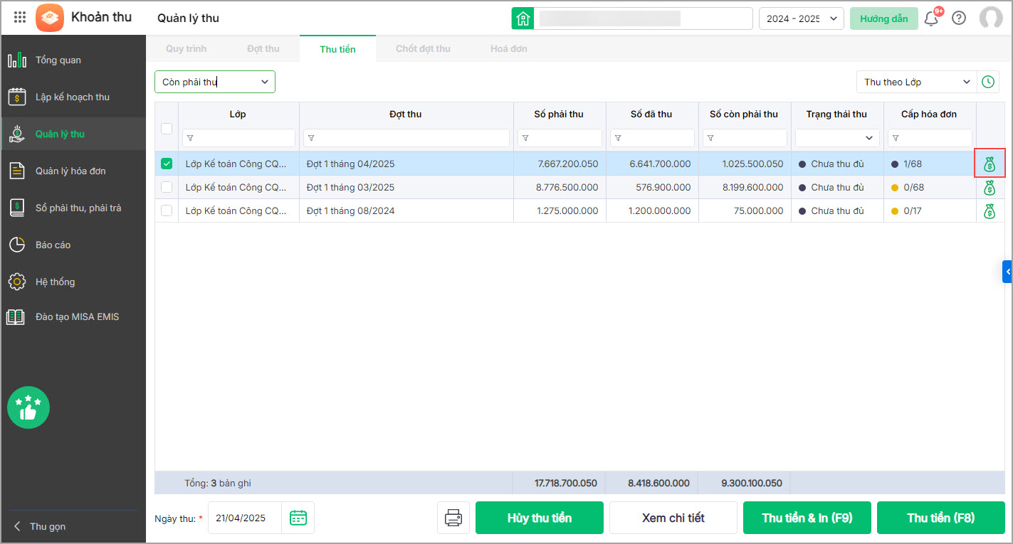 - Nhấn vào biểu tượng thu tiền tại lớp và đợt thu cần thu tiền.