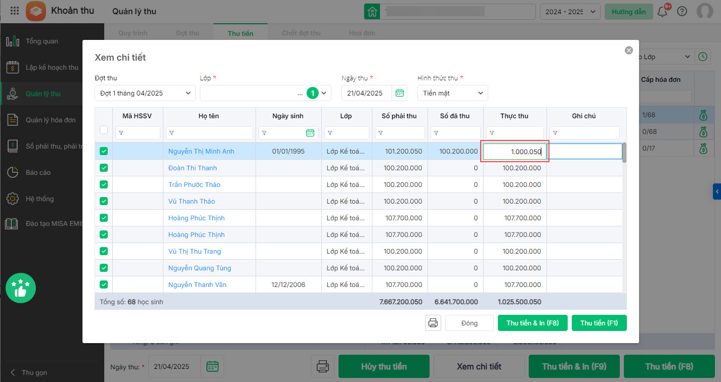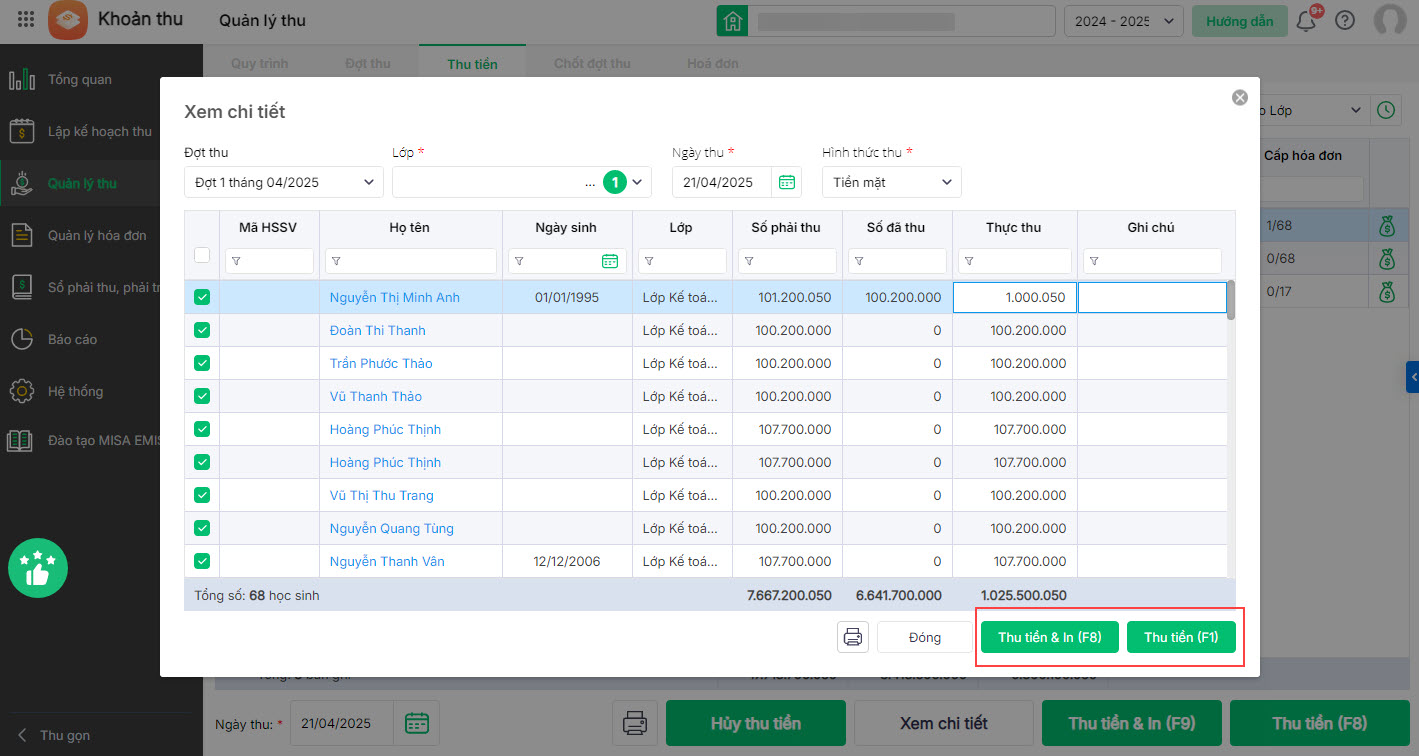 3. Nhấn Thu tiền hoặc Thu tiền và In để ghi nhận thu tiền cho cả lớp đồng thời in chứng từ thu tiền.