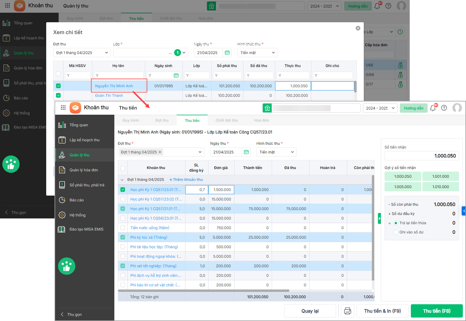 - Trường hợp HSSV có thay đổi thông tin về Số lượng, đơn giá, nộp thừa, nộp thiếu, tình trạng đăng ký khoản thu, anh/chị nhấn vào tên HSSV để thực hiện thu chi tiết theo HSSV.