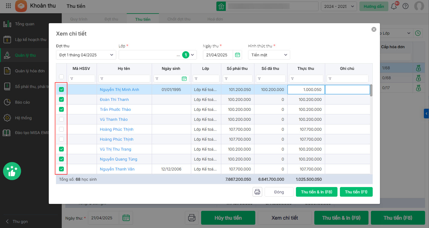 - Tích chọn các lớp và đợt thu của lớp cần thu tiền.